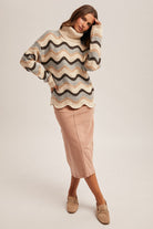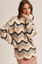 Cozy meets chic in this beautifully textured wave striped turtleneck sweater. Designed with a relaxed silhouette and soft, neutral tones, this sweater brings effortless sophistication to cooler days.