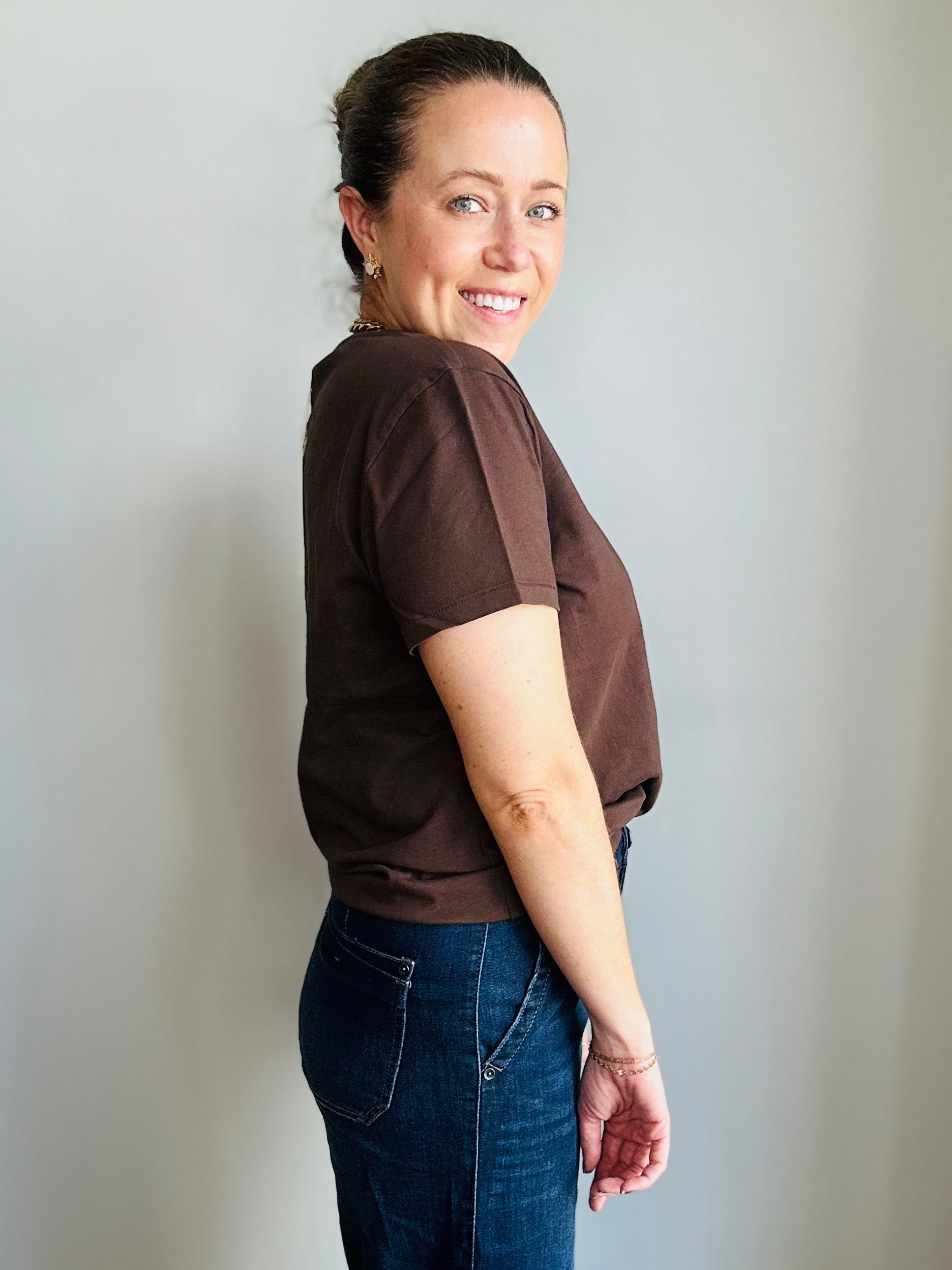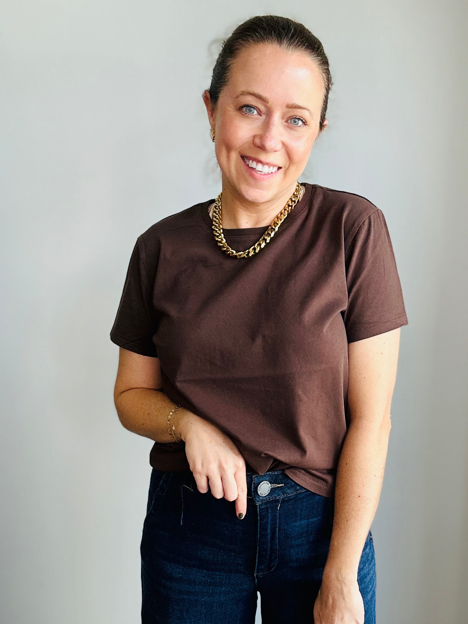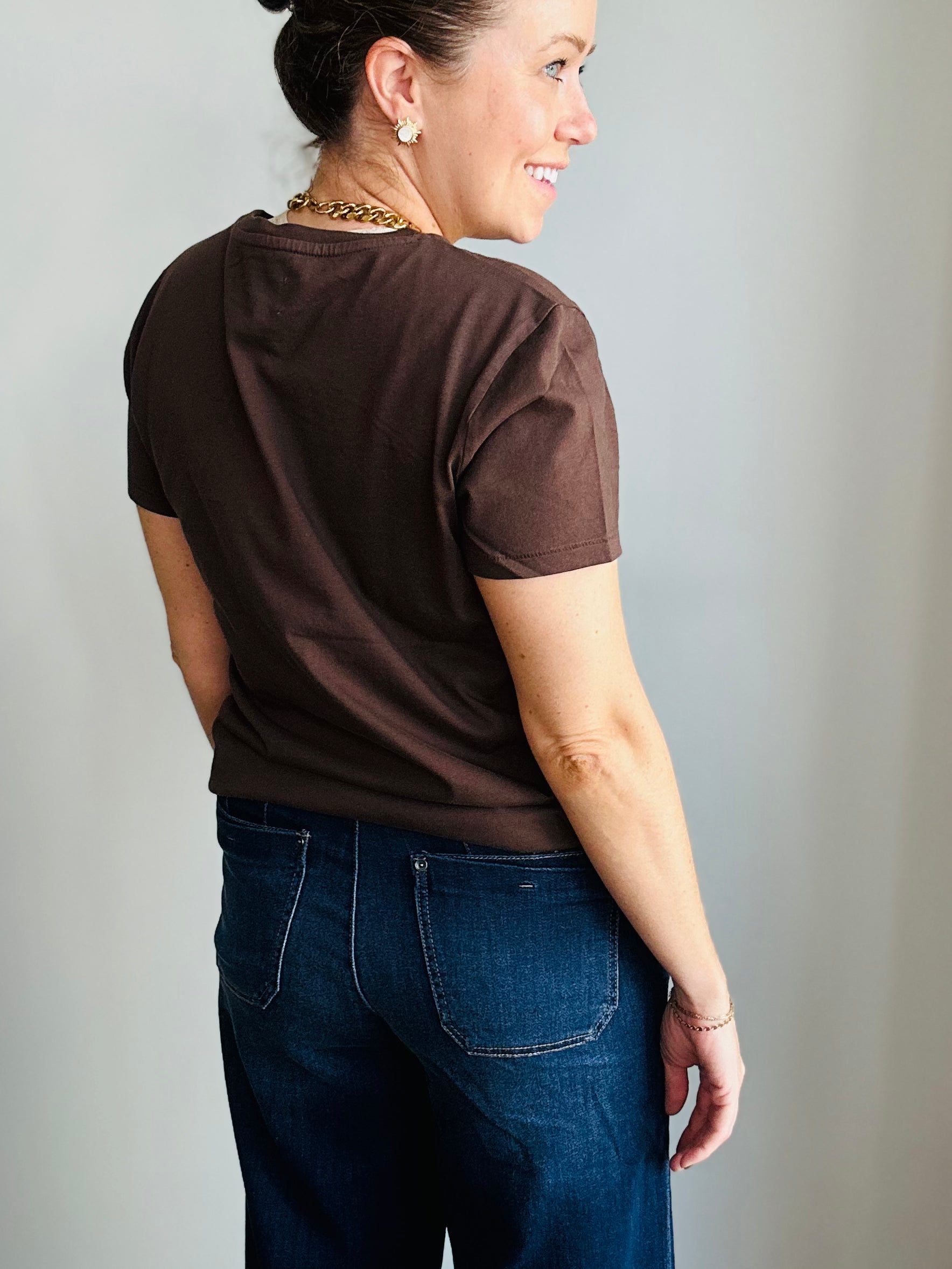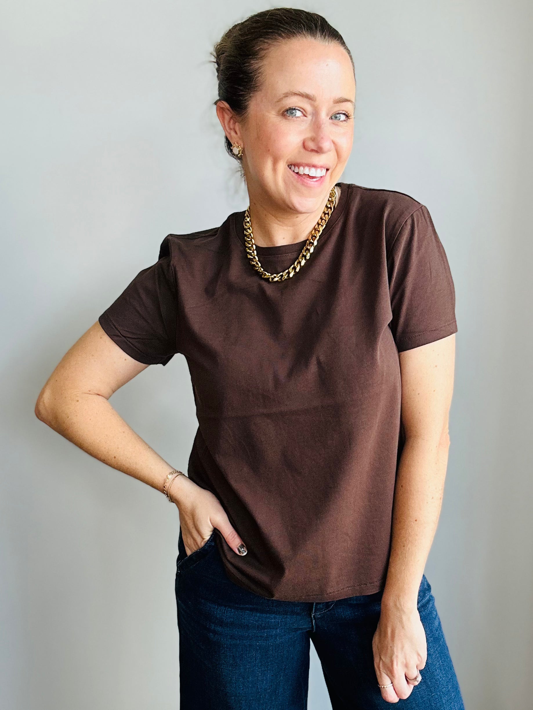A wardrobe must-have, elevated. Our chocolate brown crewneck tee takes the classic staple and gives it a luxe refresh. Made from ultra-soft cotton, it’s breathable, durable, and effortlessly chic. The rich cocoa hue feels modern yet timeless, pairing seamlessly with denim, trousers, or layered under your favorite jackets. Designed with a relaxed fit that skims the body, it’s the elevated everyday tee you’ll reach for on repeat.