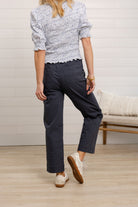 Crafted in the rich Orion shade, these pants bring a modern, elevated feel to everyday dressing. The scalloped pocket detailing adds a subtle feminine touch, while the structured yet relaxed fit makes them perfect for both casual styling and dressed-up looks. Pair them with a fitted tee, lightweight knit, or soft blouse for an effortlessly pulled-together outfit.