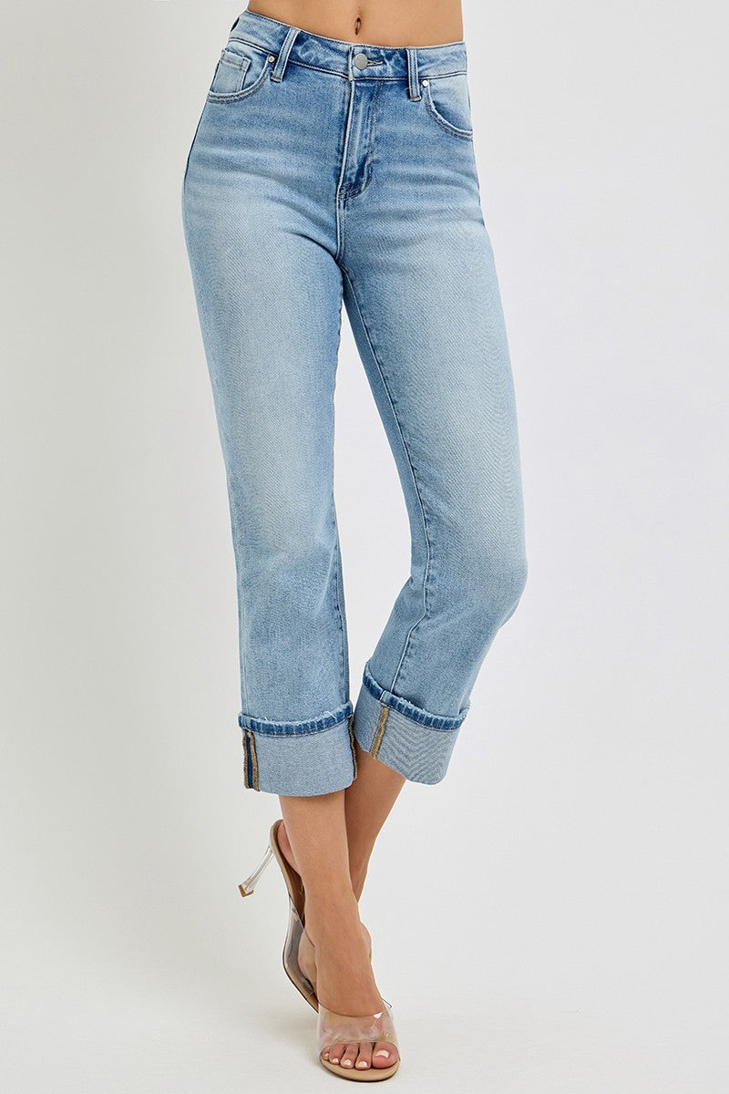 High Rise Ankle Straight Cuffed Jeans