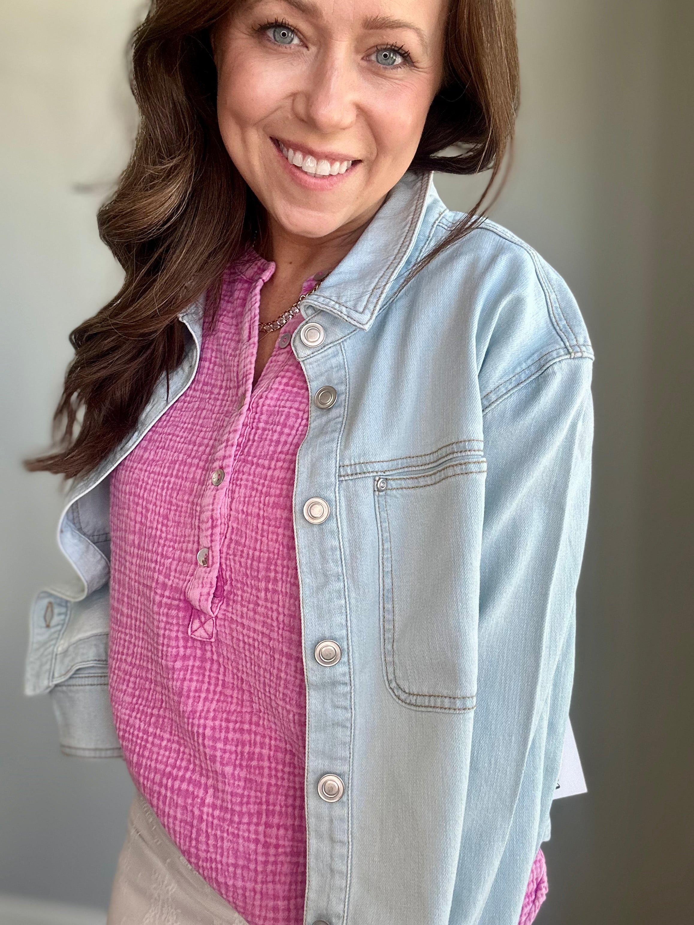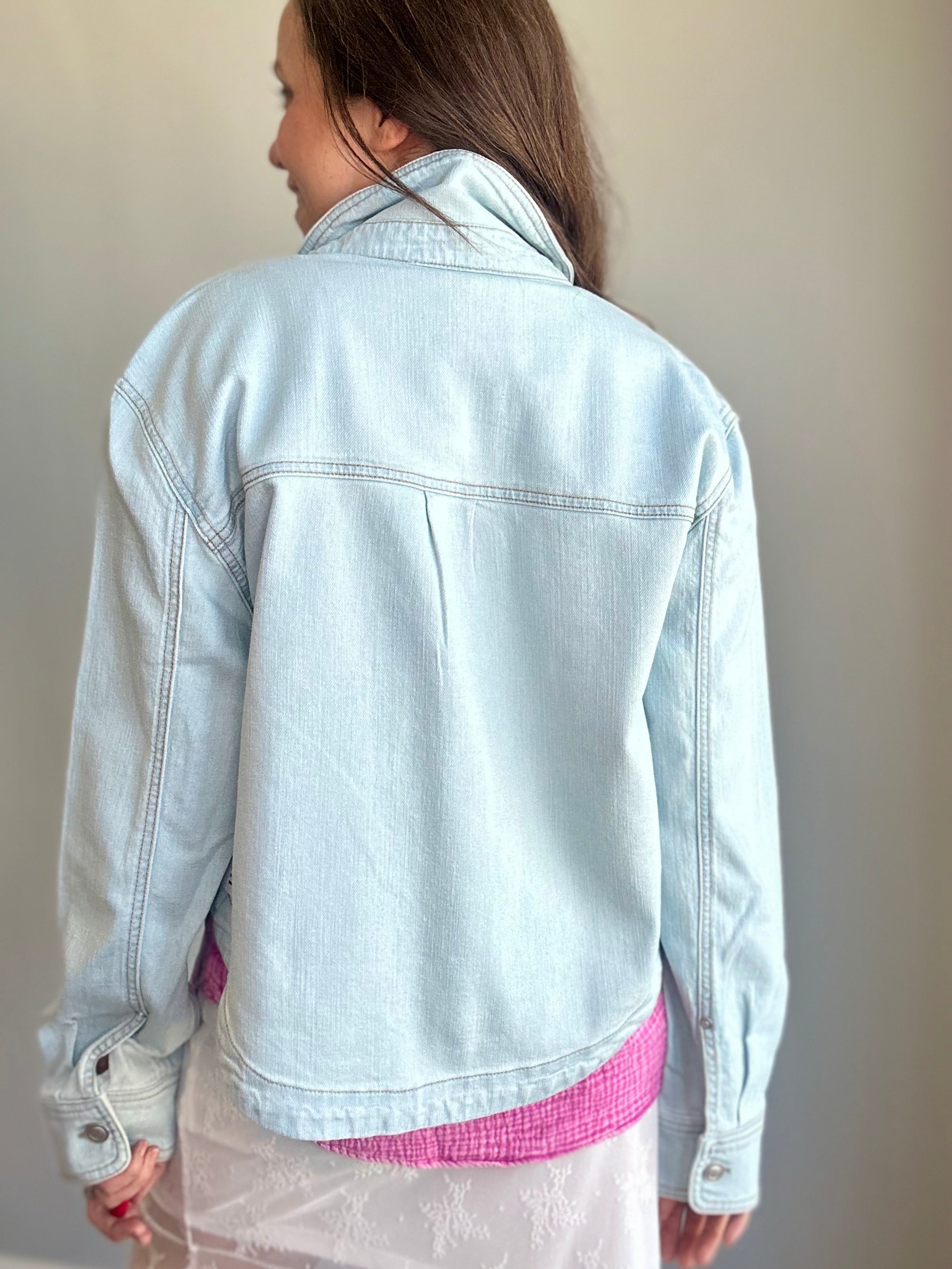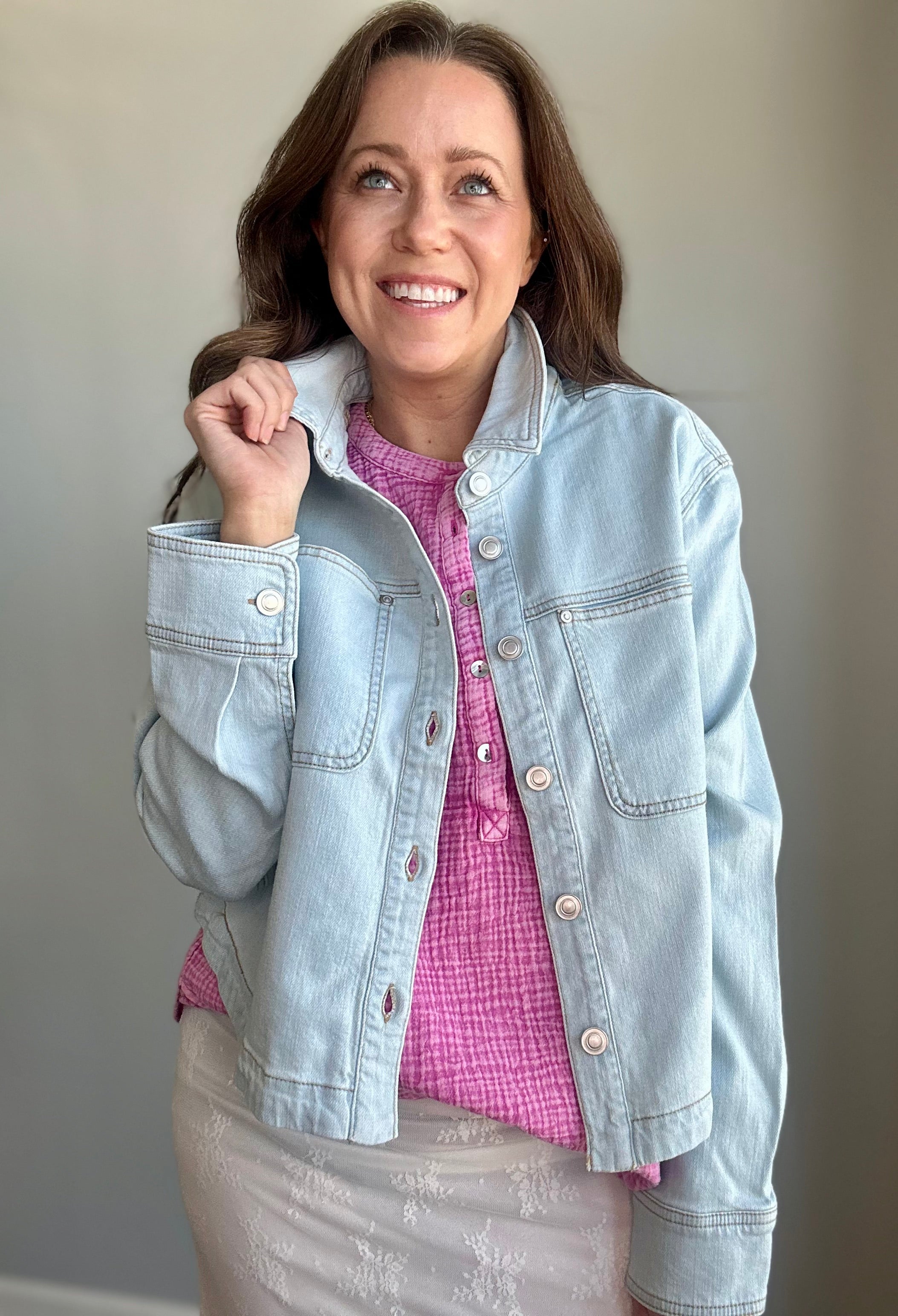 Meet your new layering essential: our Light Wash Cropped Denim Jacket is a closet staple with a fresh, modern twist. Crafted from a soft, lightweight denim, this jacket brings just the right amount of structure without feeling stiff. It features a subtle drop shoulder, oversized chest pockets, and silver-tone snap buttons for a polished yet casual finish. The pale blue wash pairs effortlessly with everything from feminine dresses to relaxed joggers, making it a versatile piece you’ll reach for year-round.