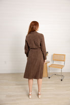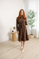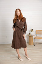 Elevate your wardrobe with this timeless brown belted midi shirt dress, designed for both everyday wear and polished occasions. The rich chocolate hue pairs beautifully with everything from boots to heels, while the soft textured fabric adds depth and dimension to your look.