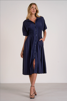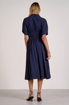 Smocked Waist Zip-Front Midi Dress – Navy