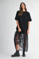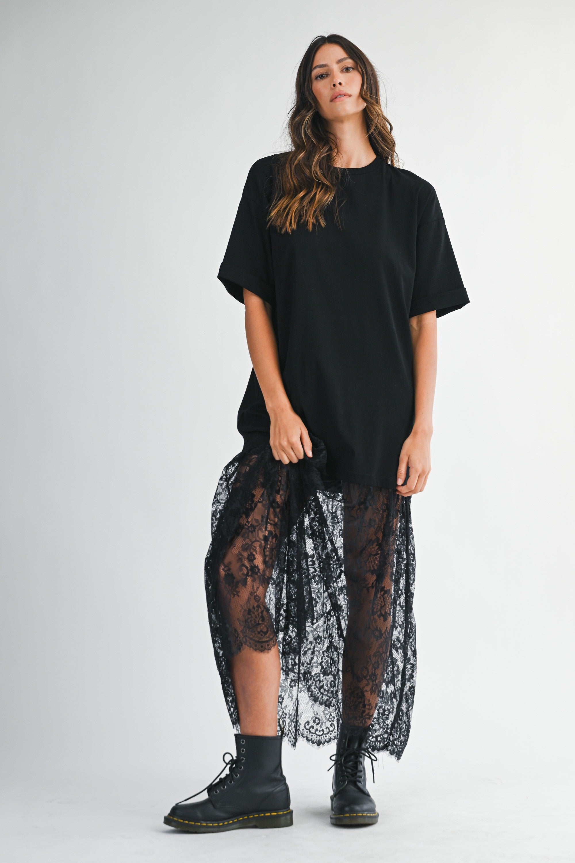 Meet your new statement staple: The Lace Layered Tee Maxi Dress. This effortlessly cool maxi combines the ease of an oversized T-shirt dress with the drama of a sheer lace skirt overlay for a look that’s both edgy and elevated. Designed with comfort in mind, the soft, stretchy rayon blend moves with you while the contrast lace adds texture and visual interest.
