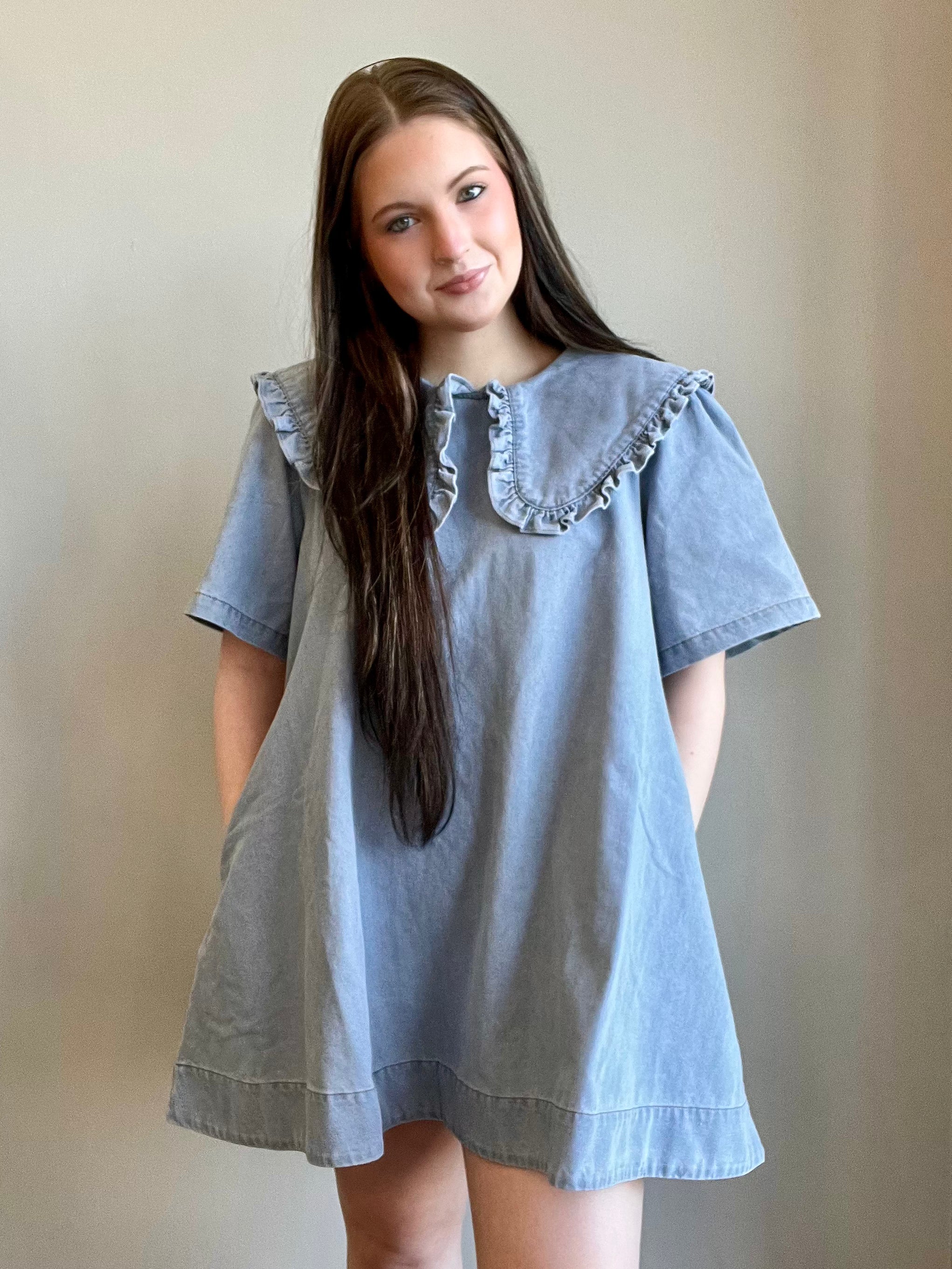 Step into timeless charm with this Vintage Denim Babydoll Dress. Designed for the modern romantic, this dress features a soft, washed denim fabric paired with a statement oversized ruffled collar. Its relaxed A-line silhouette and playful mini length make it perfect for casual days, while its subtle details add an elevated touch. Whether paired with ankle boots or sneakers, this versatile dress will become a staple in your wardrobe.