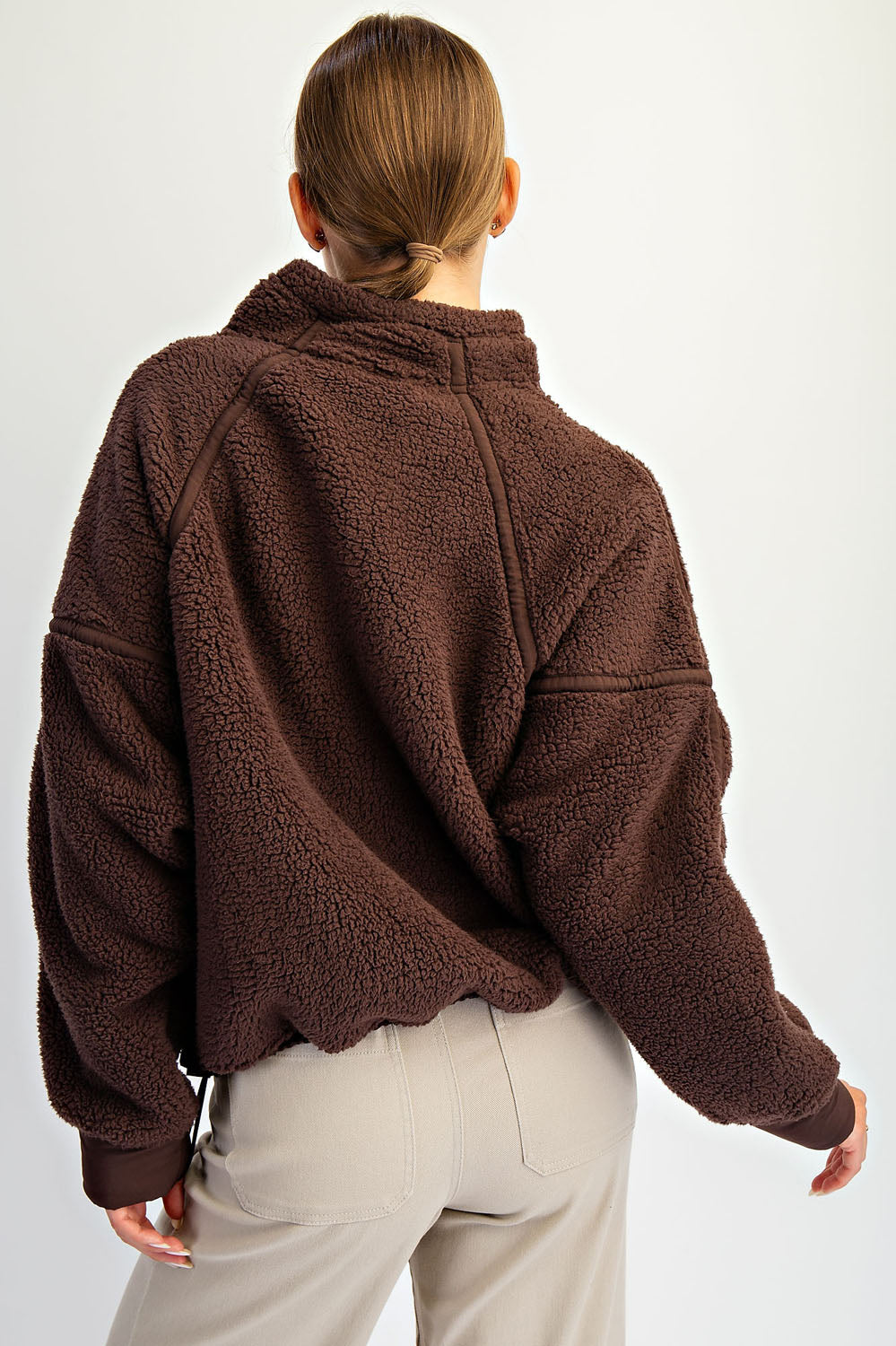 Cozy up in elevated comfort. This plush sherpa quarter-zip pullover delivers all the warmth you crave without the bulk. Made from ultra-soft sherpa fabric with a light, airy feel, it’s the perfect layering piece for chilly days. Designed with a relaxed fit, dropped shoulders, and a mock neckline, it’s equal parts comfy and effortlessly cool.