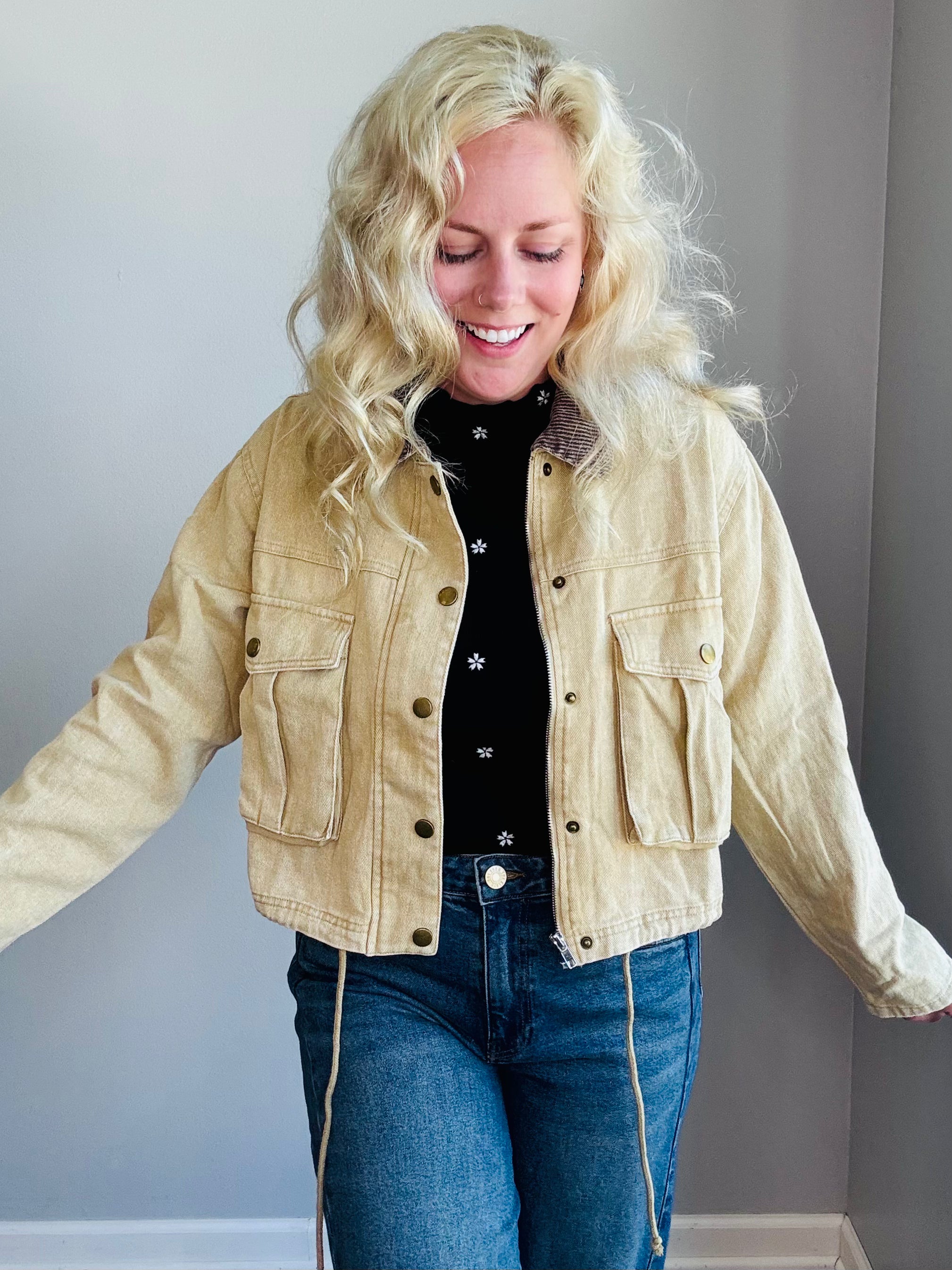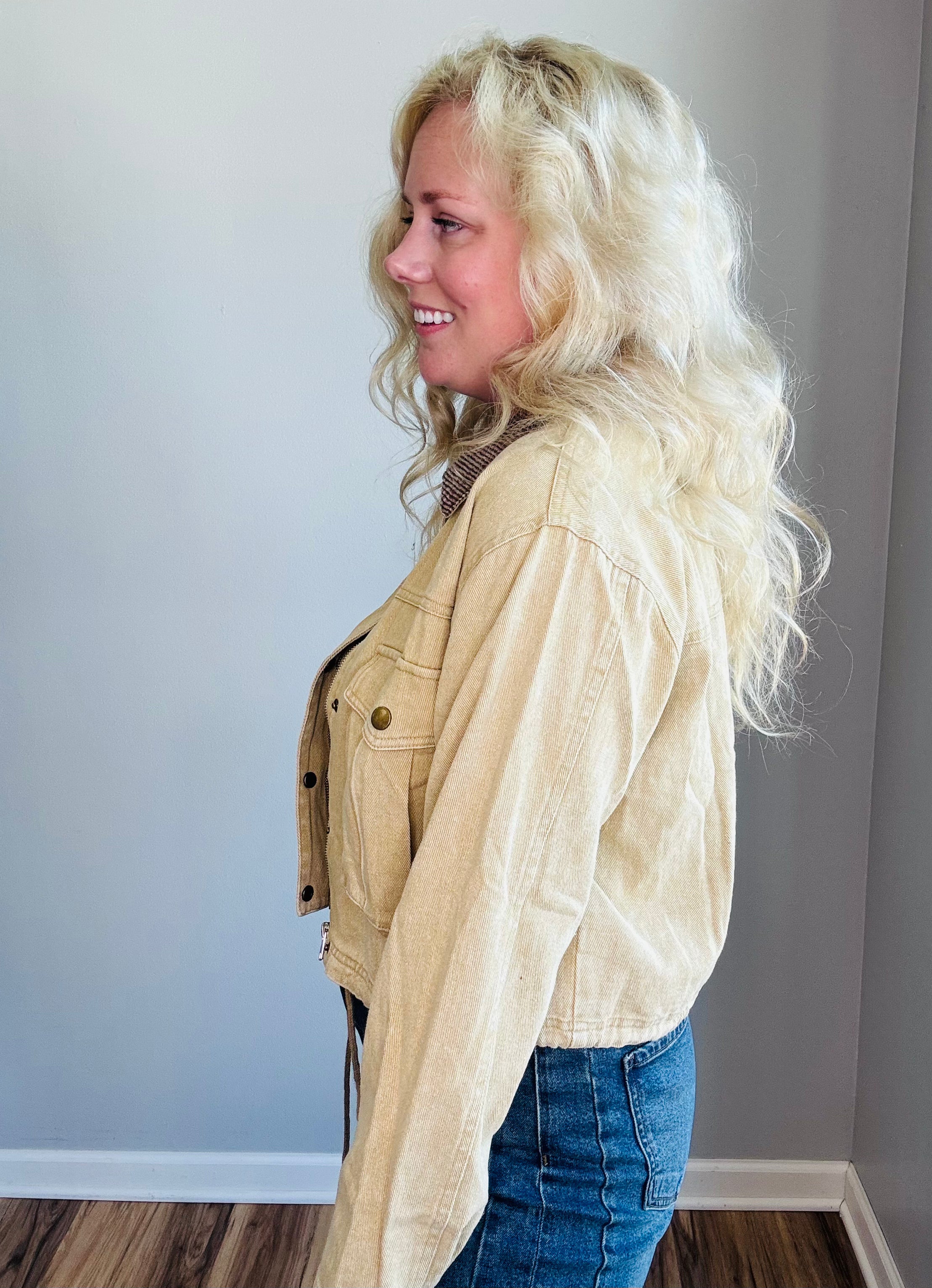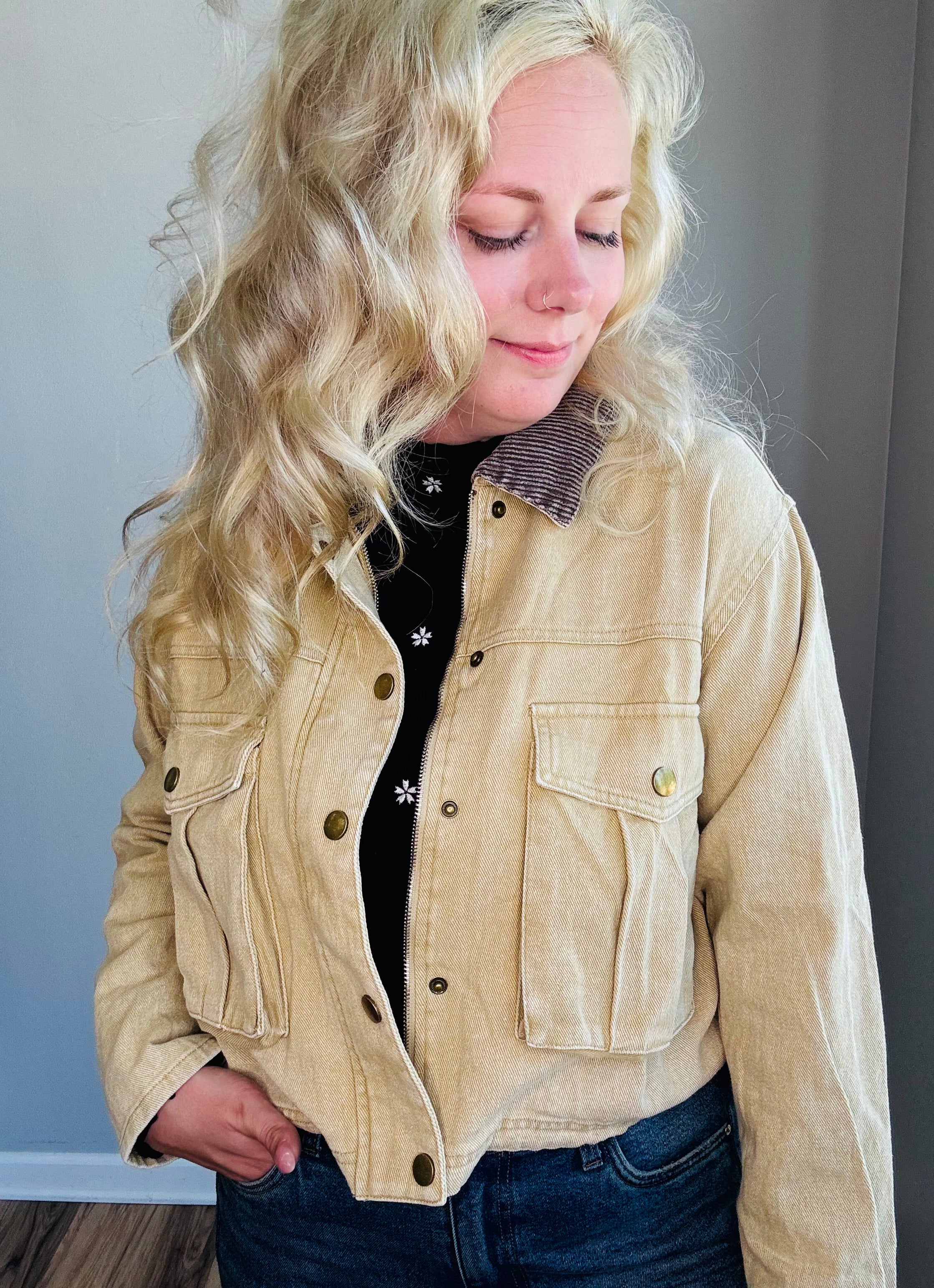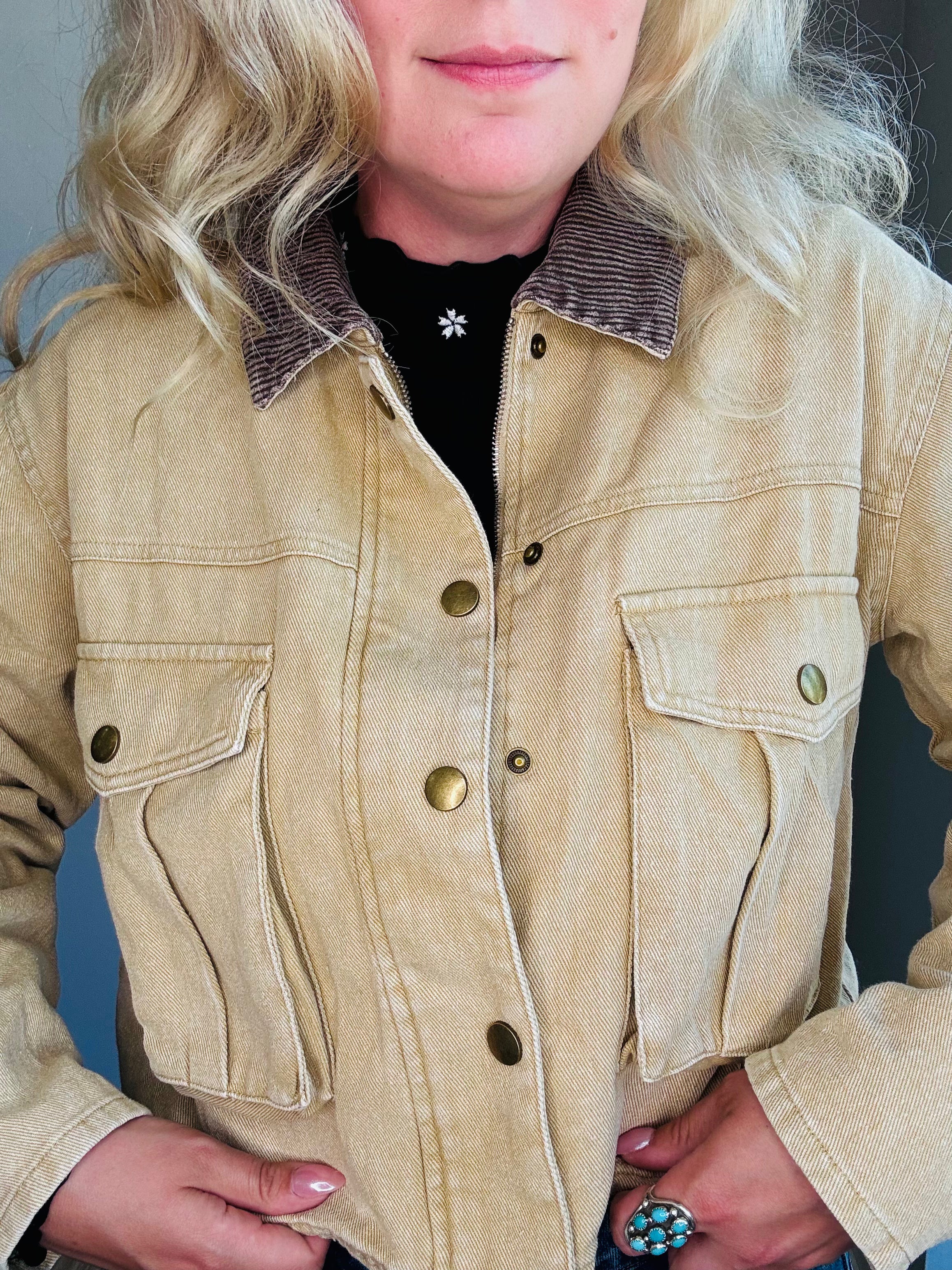 Meet The Sierra Corduroy Utility Jacket — the elevated outerwear layer your wardrobe’s been waiting for. Crafted from premium 100% cotton corduroy with a softly structured feel, this oversized jacket blends vintage western appeal with a modern, feminine edge. Designed with a contrast ribbed corduroy collar, front utility flap pockets, and polished brass-tone snap buttons, it’s equal parts rugged and refined. Whether you're heading to work or out for a weekend stroll, this versatile layer adds boutique-worthy style to any outfit.