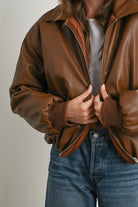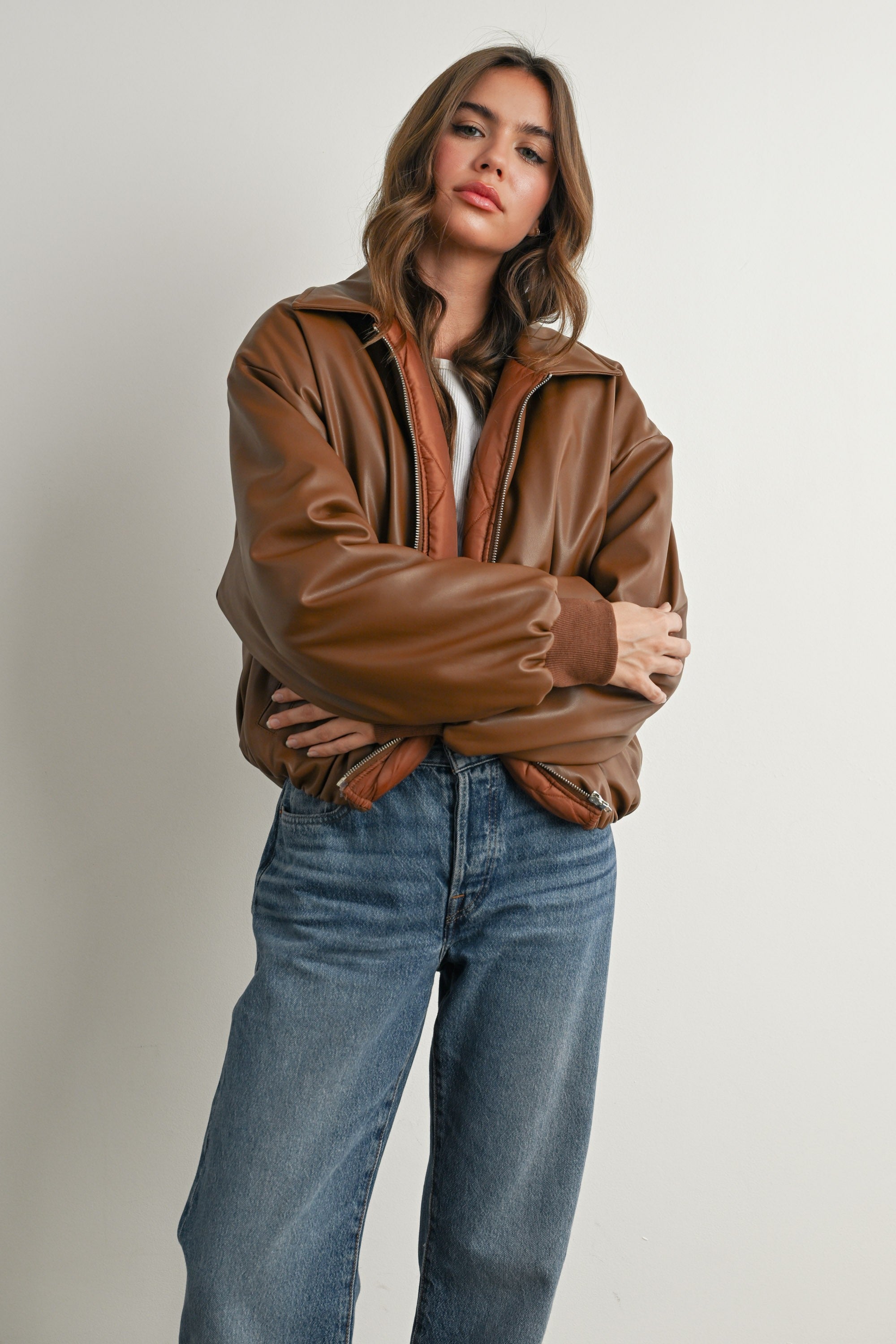 A standout layer for the cooler months. This quilted bomber jacket blends a sleek faux leather finish with cozy, insulated warmth for everyday wear. The oversized silhouette creates an effortless, relaxed shape, while rib-knit cuffs and hem bring in that classic bomber feel. A tonal quilted inside panel adds visual dimension and a touch of urban edge.