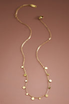 Elevate your everyday look with the effortless elegance of this 18K Gold Plated Dainty Disc Necklace. Crafted from durable stainless steel, this minimalist necklace features a delicate chain adorned with evenly spaced, polished gold disc charms. Whether layered with other favorites or worn solo, it adds a soft shimmer that complements any outfit—from casual tees to dressy necklines.