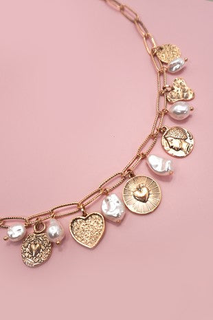 Meet your new statement piece: the Celestial Heart & Pearl Charm Link Necklace. This stunning gold-tone chain is adorned with an eclectic mix of romantic heart medallions, celestial motifs, and luminous faux pearls—each charm telling its own story. Whether layered with your everyday favorites or worn alone for a standout moment, this piece blends vintage inspiration with modern edge for effortlessly elevated style.