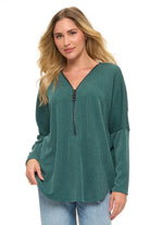 Perfect for layering or wearing on its own, this zip-front dolman top blends casual ease with modern style. Pair it with jeans for everyday wear or dress it up with statement accessories for a chic, elevated look.