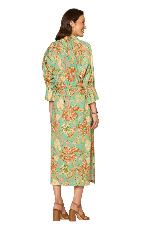 Designed in a vibrant floral print set against a soft green backdrop, this midi-length dress features a flattering, relaxed silhouette with thoughtful details throughout. The button-front neckline adds versatility, while the adjustable self-tie belt defines the waist for a customizable fit.