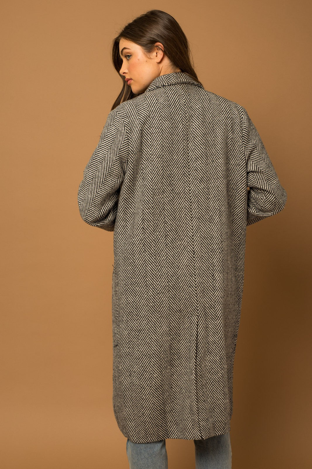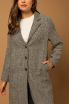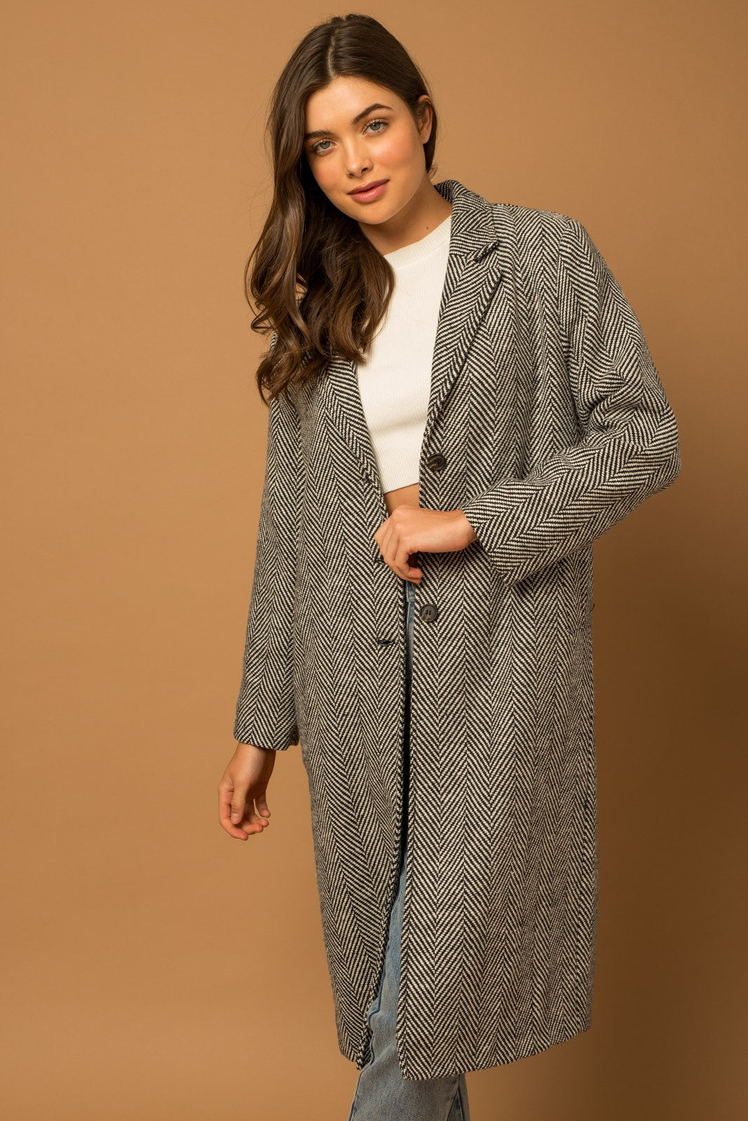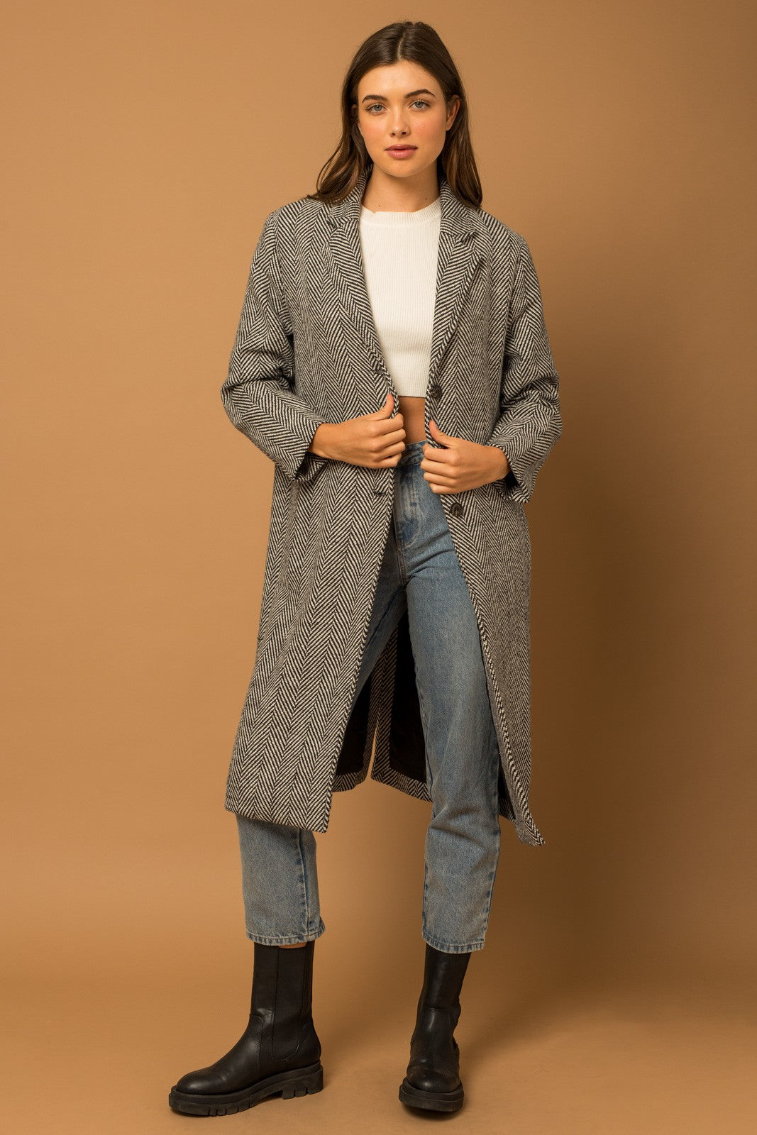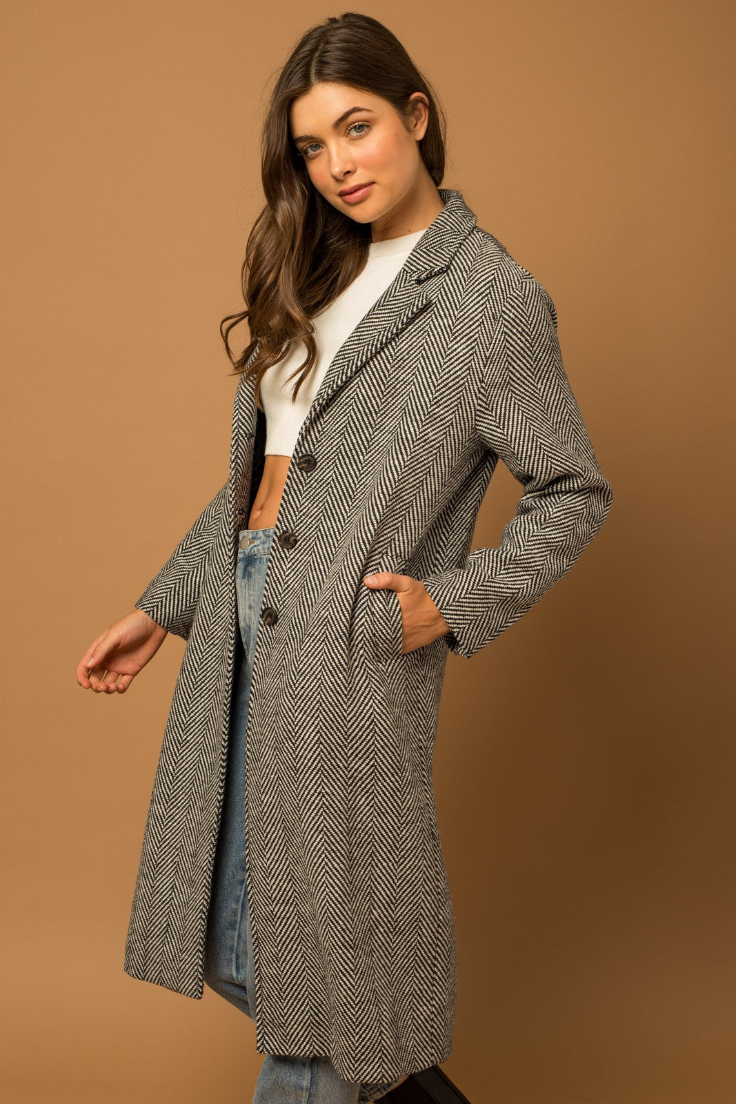 A timeless outerwear piece with refined sophistication. This herringbone longline coat features a classic tailored fit with notched lapels, button front closure, and practical side pockets. The subtle black-and-cream pattern adds depth and texture, creating a versatile look that pairs beautifully with denim, dresses, or workwear.