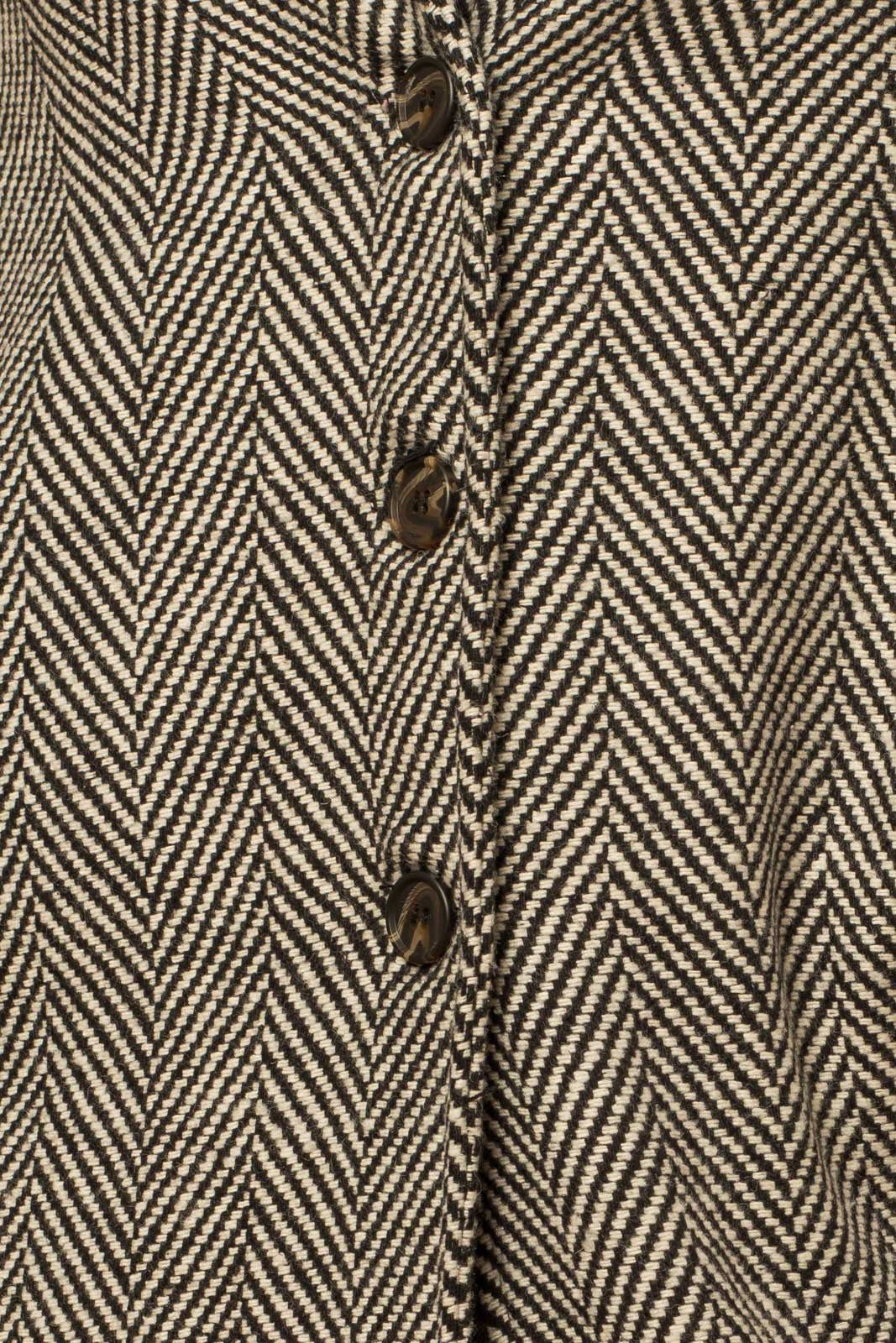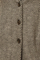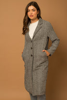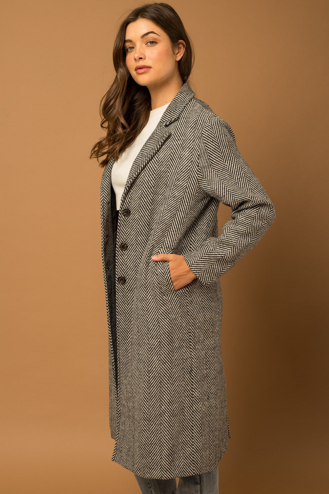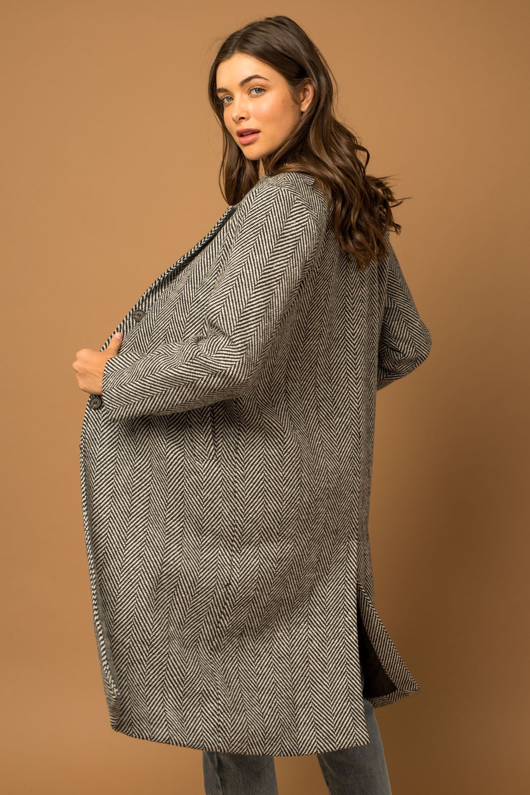 A timeless outerwear piece with refined sophistication. This herringbone longline coat features a classic tailored fit with notched lapels, button front closure, and practical side pockets. The subtle black-and-cream pattern adds depth and texture, creating a versatile look that pairs beautifully with denim, dresses, or workwear.