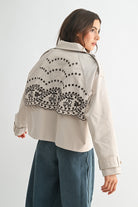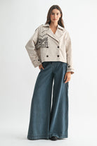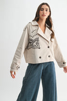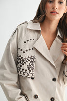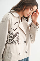 A modern twist on timeless tailoring — this embroidered trench jacket blends structure, sophistication, and artistry in one stunning piece. Designed in a soft neutral beige hue, it features an eye-catching scalloped embroidered overlay and a double-breasted silhouette that adds just the right touch of polish. Statement buttons, adjustable cuffs, and shoulder epaulets lend a classic trench feel, while the cropped length keeps it contemporary and easy to style.