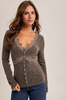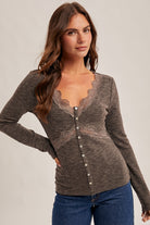 Romantic, soft, and effortlessly flattering — this ribbed long sleeve top features delicate lace trim along the neckline and waist for a subtly sculpted silhouette. The button-front design adds versatility, making it easy to wear dressed up or down. Made with a stretchy rib knit for comfort and a curve-hugging fit, this piece brings feminine charm to your everyday style.