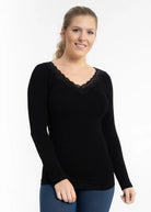 An everyday essential with a feminine twist. This Lace Trim Long Sleeve features a flattering V-neckline accented with delicate lace trim for a soft, romantic touch. Designed with a smooth, stretchy fabrication, it hugs comfortably without feeling tight—making it perfect for layering or wearing on its own.