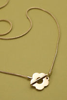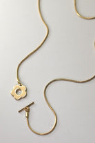 Delicate yet eye-catching, this minimal gold flower necklace adds a touch of modern elegance to any look. Featuring a smooth snake chain and a sleek gold-plated flower toggle pendant, it’s the perfect everyday accessory with just the right amount of charm.
