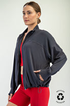 Throw it on with leggings, bike shorts, or joggers for effortless layering. Whether you’re running errands or heading to the studio, this eco-conscious jacket keeps your look sleek and functional.