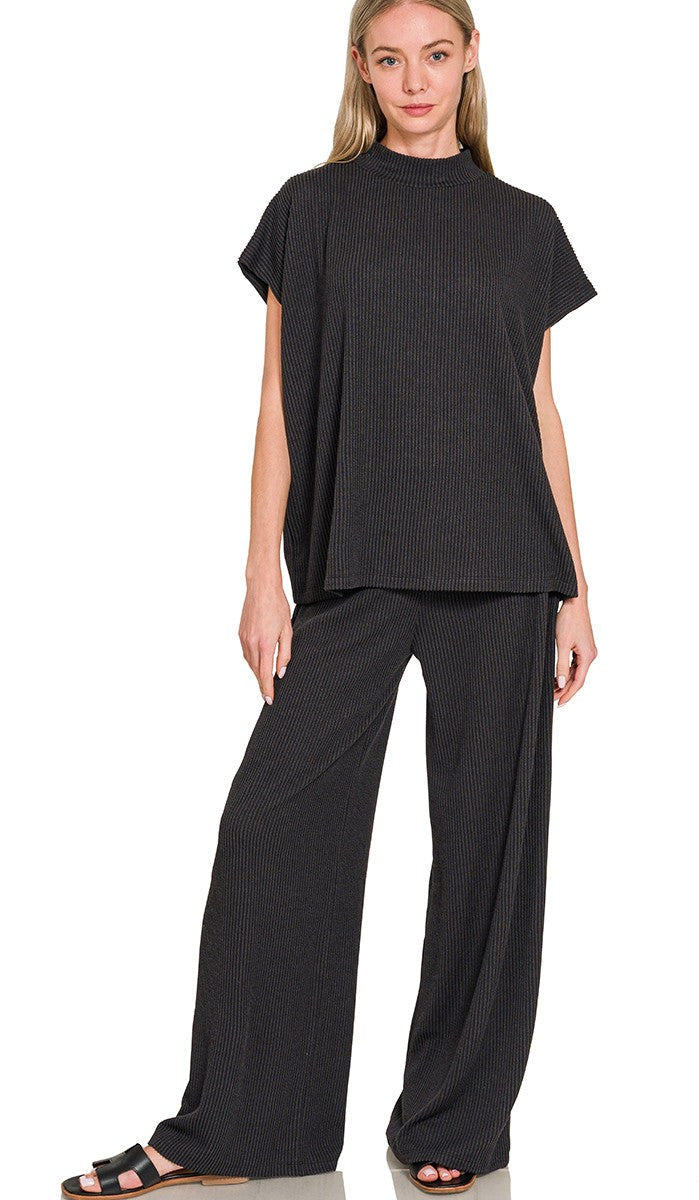 Stay effortlessly chic and comfortable in our Raised Rib Short Sleeve Tee & Wide-Leg Pants Set, designed for everyday wear with a touch of elevated style. Crafted from a soft, textured rib knit, this two-piece set combines a modern mock-neck tee with flowy, wide-leg pants—perfect for lounging, travel, or casual outings.
