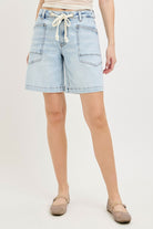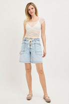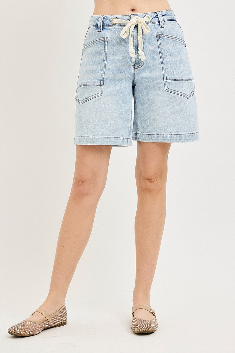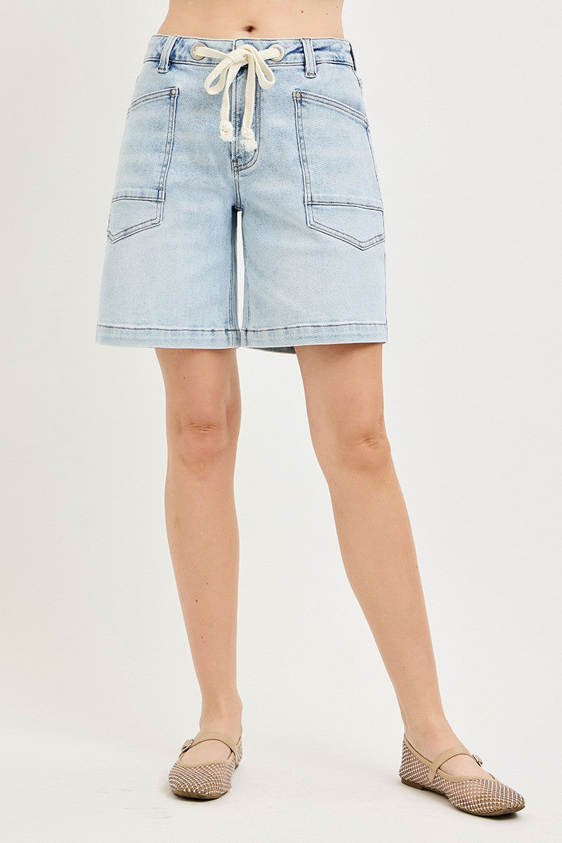 Laid-back meets elevated in these slouchy denim jorts designed for all-day comfort. Featuring a relaxed fit and longer length, these give you that effortless, on-trend look while still feeling easy and wearable. The standout detail? A functional drawstring waistband with eyelet accents that adds a casual, almost lounge-inspired twist to classic denim.