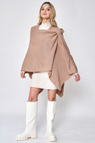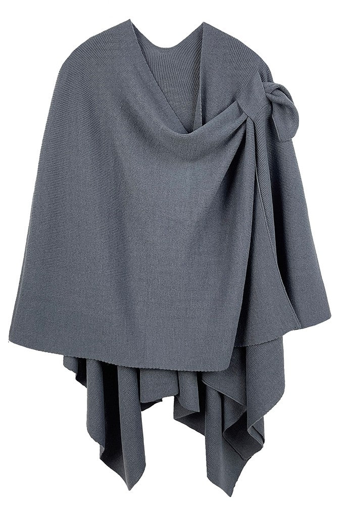 A timeless layer with effortless elegance. This solid knit ruana features a draped silhouette that moves beautifully and offers just the right amount of warmth. The adjustable shoulder strap detail keeps the wrap in place while adding a refined, sculptural touch — no slipping or constant readjusting. Perfect for everyday layering and special occasions alike.