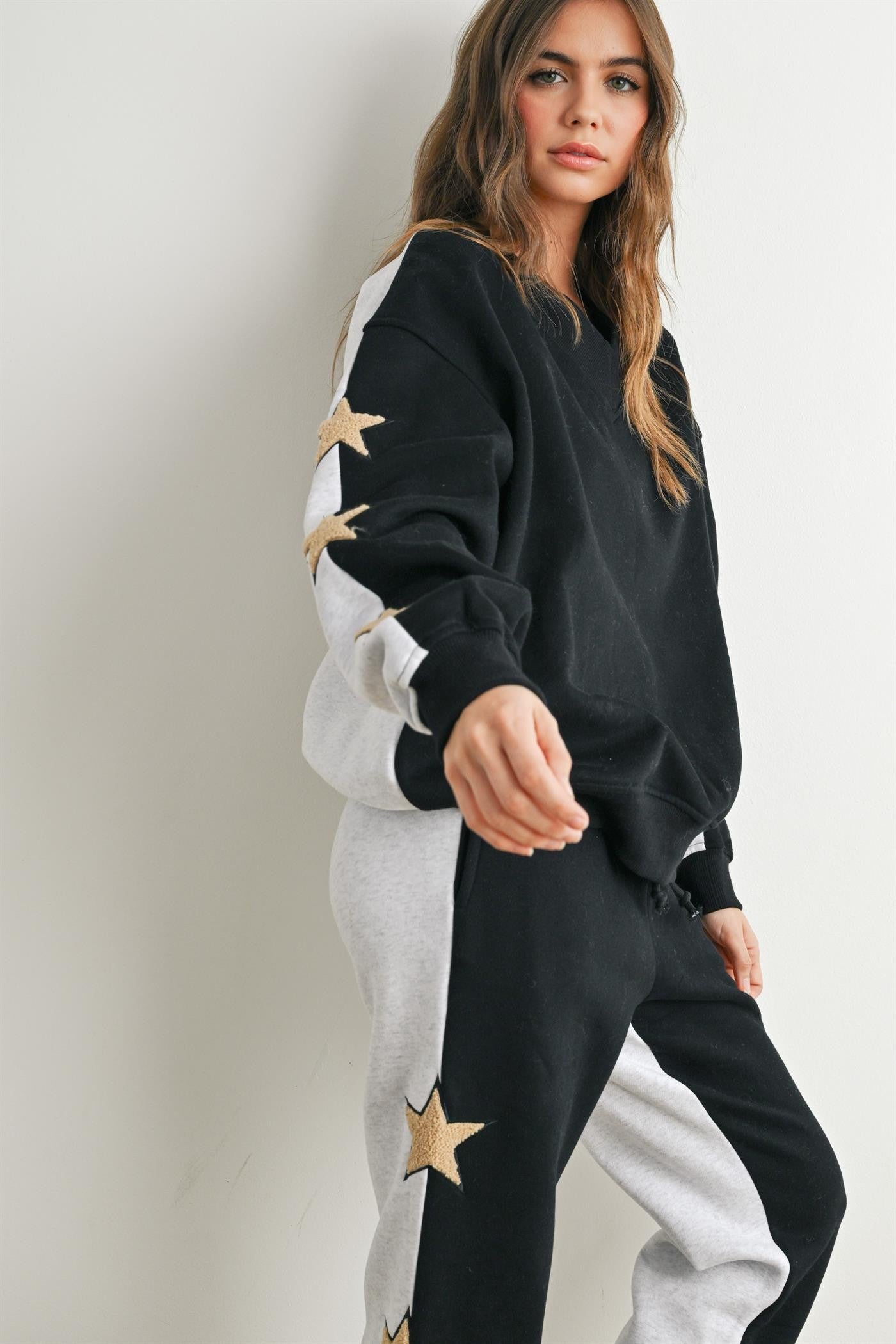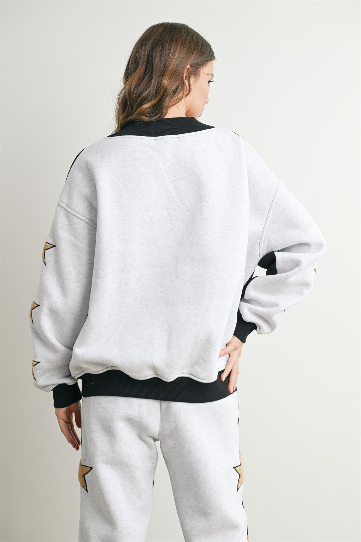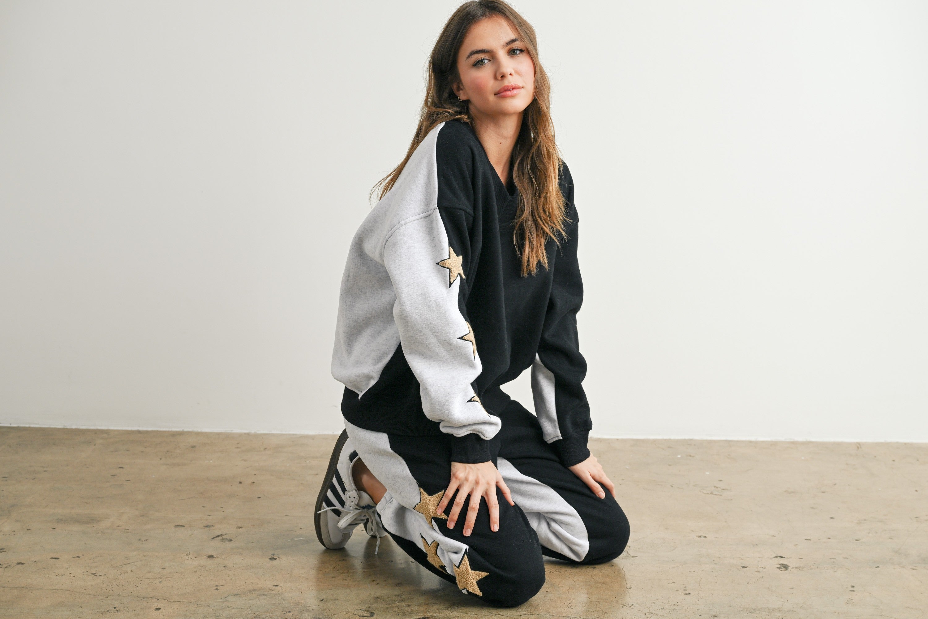 Add a little sparkle to your off-duty style with our Star Sleeve Sweatshirt — where cozy comfort meets casual cool. Designed in a soft cotton-blend fabric, this relaxed pullover features colorblock paneling and statement star appliqués along the sleeves for a touch of playful edge. Whether lounging at home or heading out for errands, it’s the perfect piece for staying effortlessly stylish and comfortable all day long.