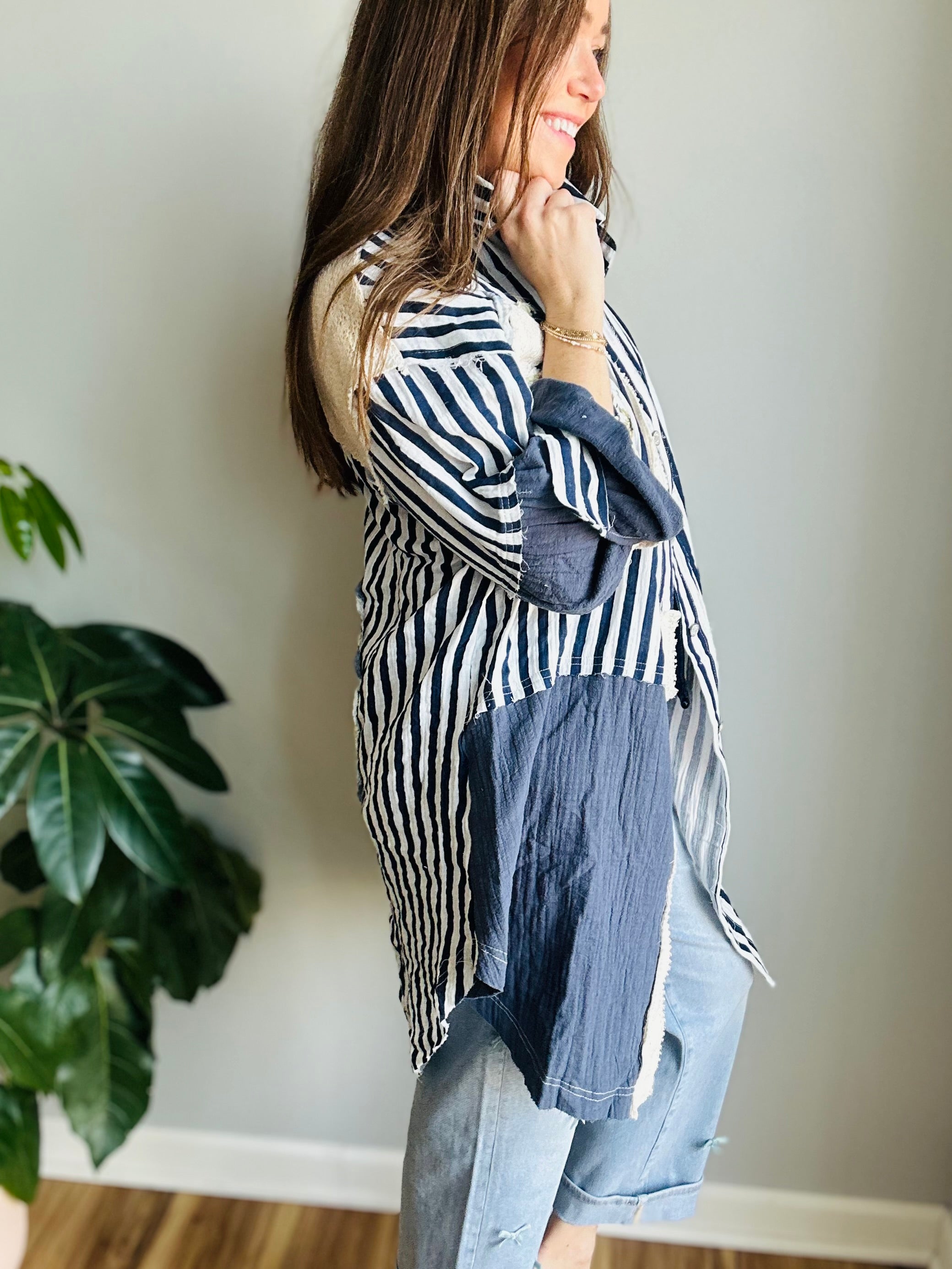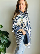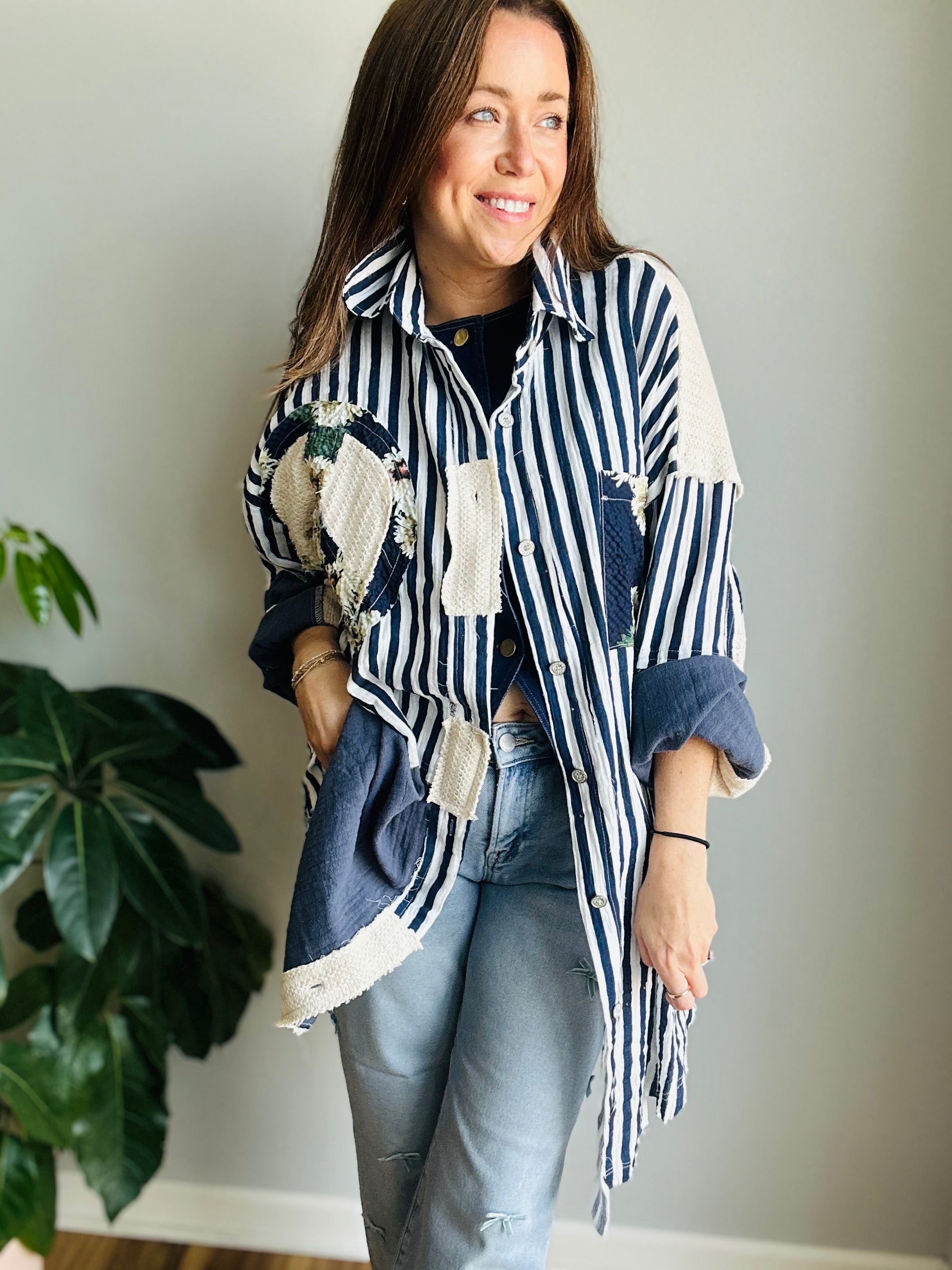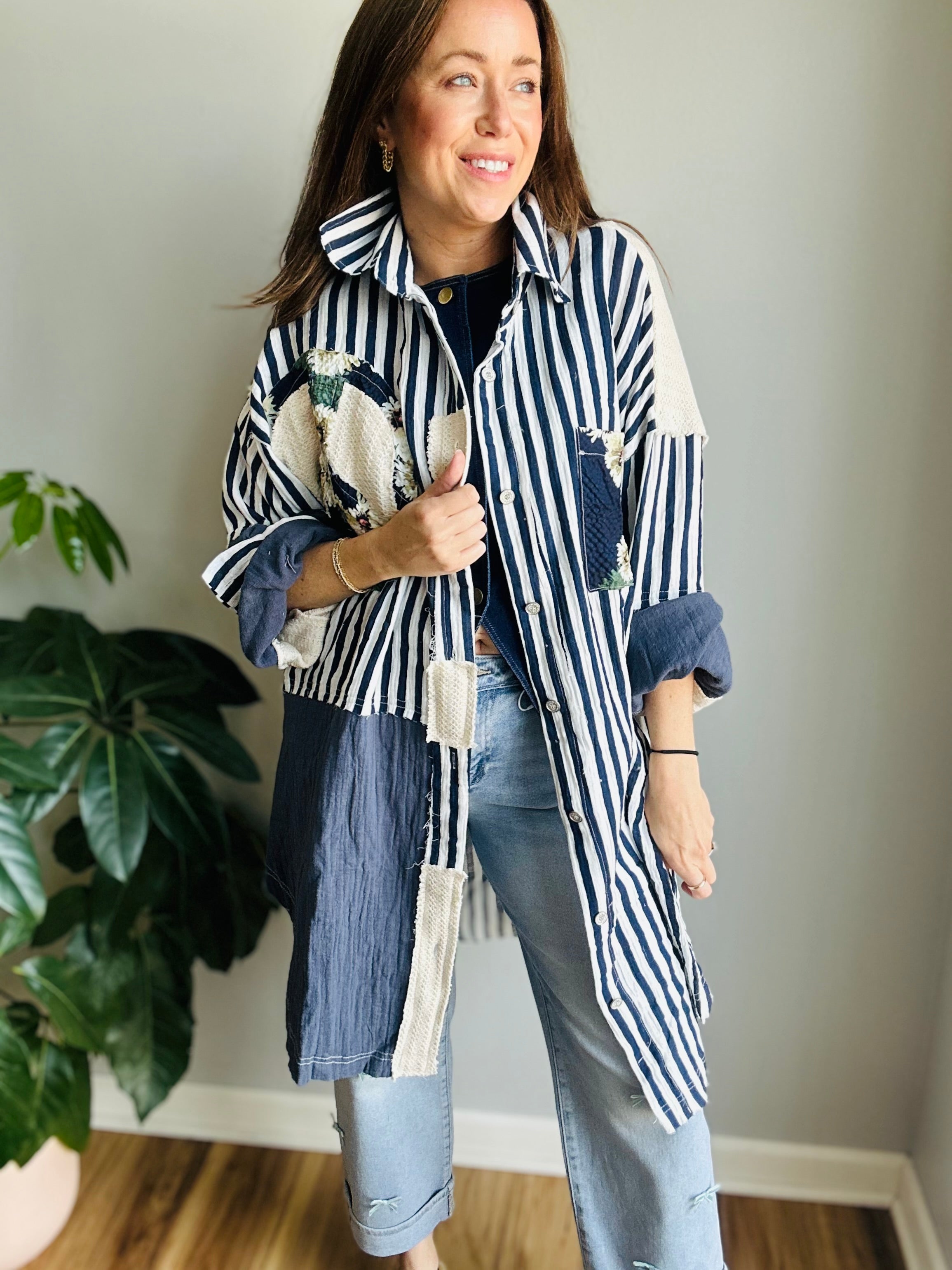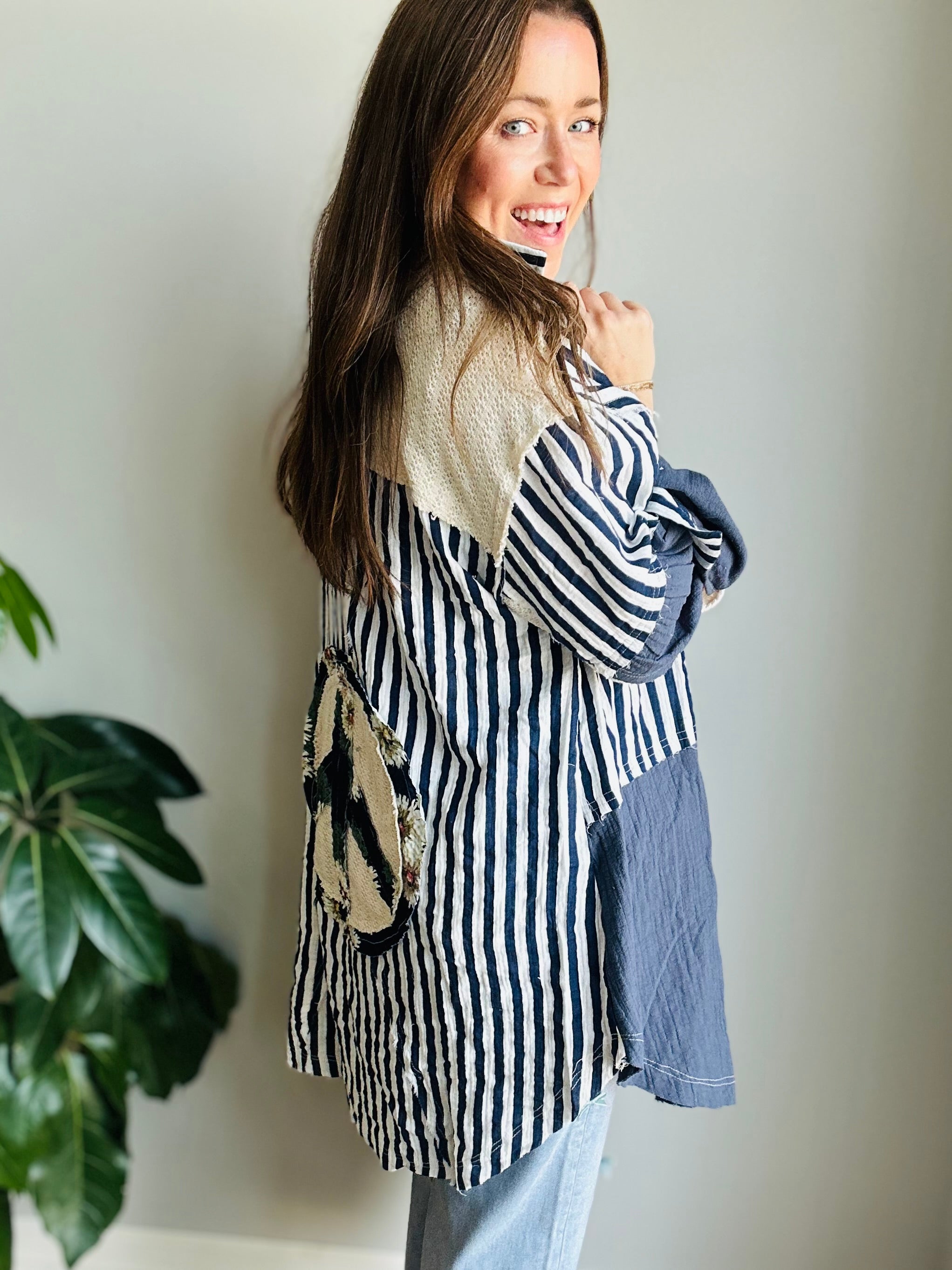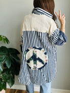 A true statement piece with a free-spirited vibe, this long striped duster blends bold patchwork, floral appliqué accents, and a back peace sign design for a playful boho look. The oversized silhouette makes it perfect for layering, while the lightweight mixed fabrics keep it breezy and comfortable for year-round wear.