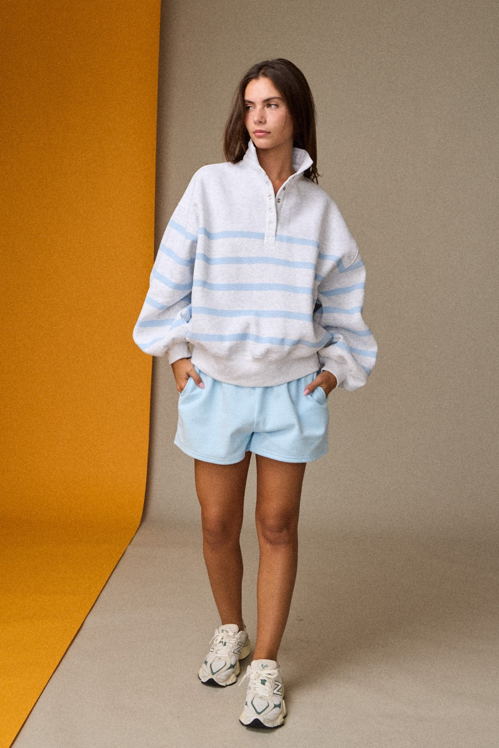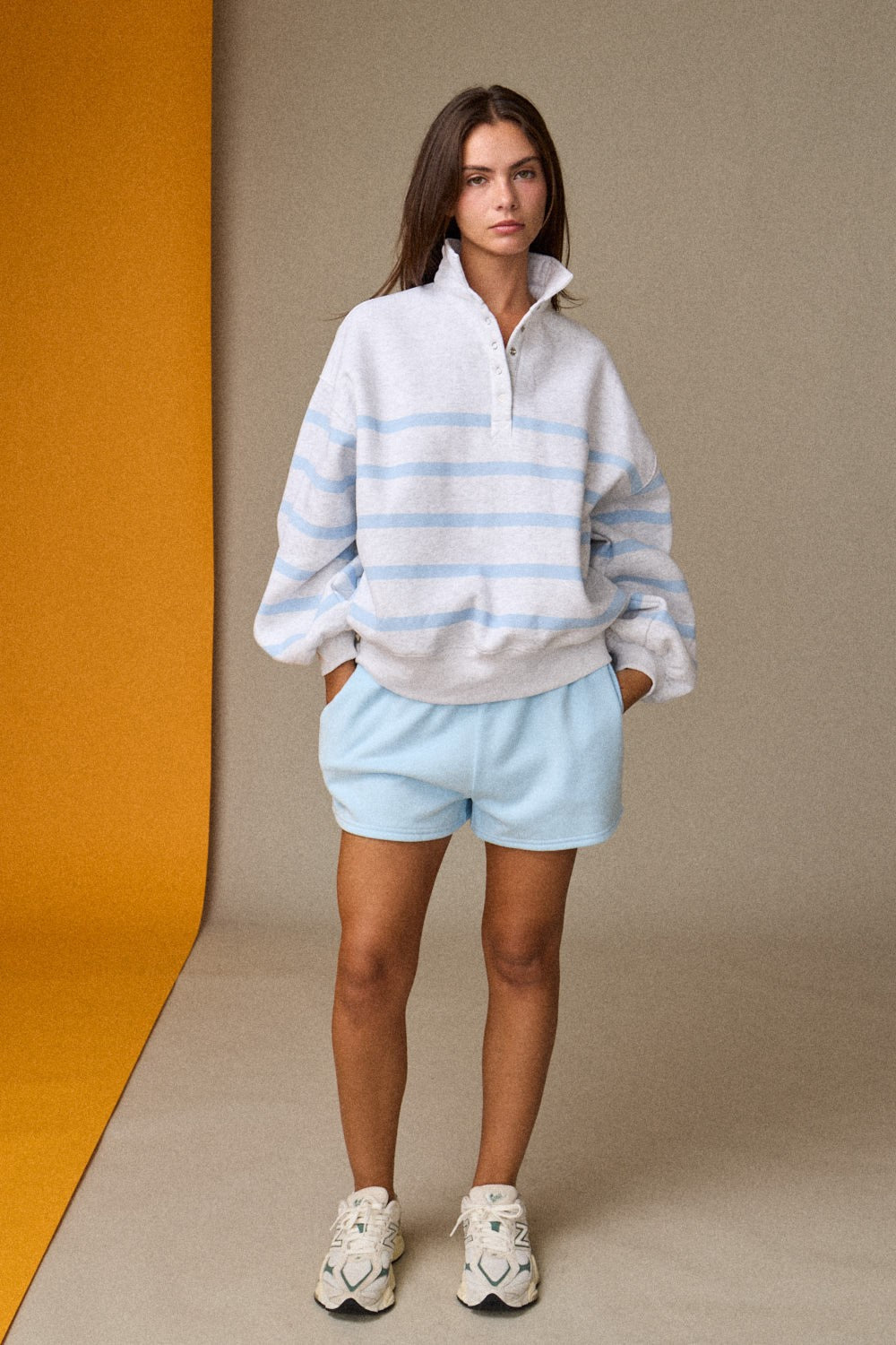 Designed with bold horizontal stripes and a structured polo collar, this pullover blends classic prep with modern comfort. The button placket neckline adds a vintage-inspired touch, while the oversized silhouette gives it that perfectly relaxed, borrowed-from-the-boys feel.