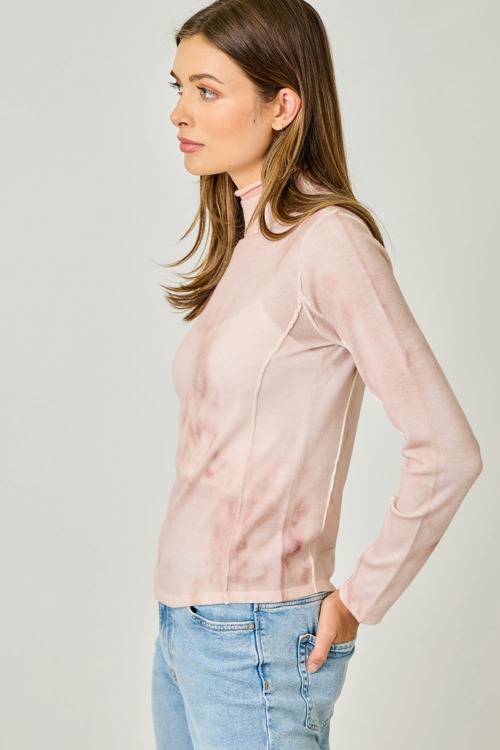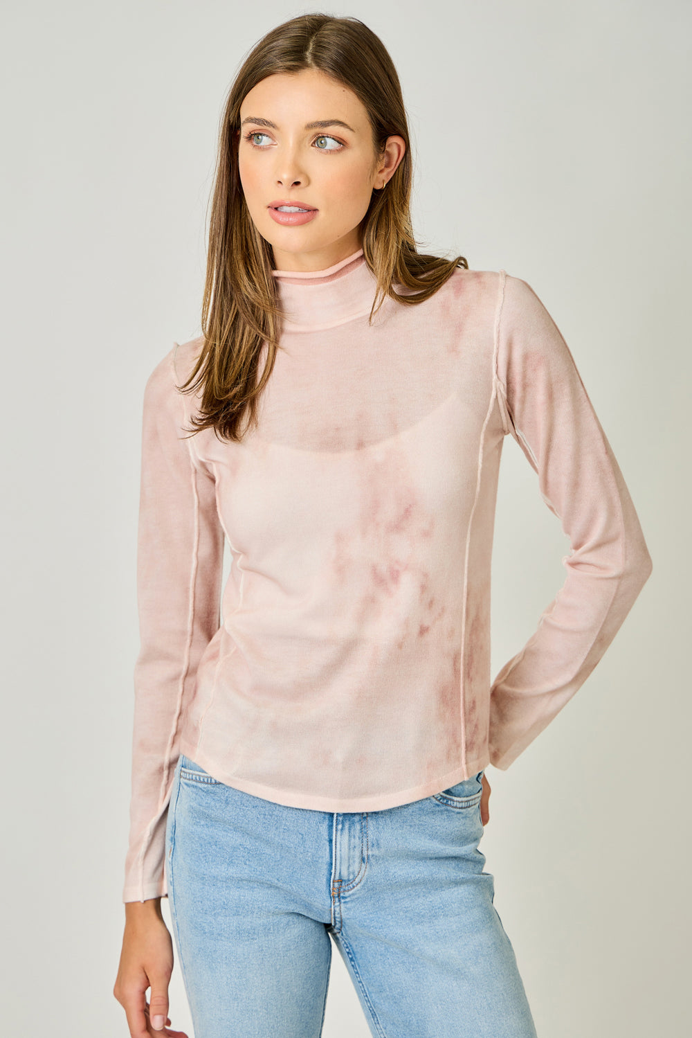 Bring a soft pop of color to your fall wardrobe with this beautifully unique spray-dye turtleneck. Designed with a rolled mock neck and subtle exposed seam details, this top blends everyday comfort with an effortlessly modern look. The lightweight knit offers gentle stretch, making it perfect for layering under jackets, cardigans, or wearing solo for a chic, minimal vibe.