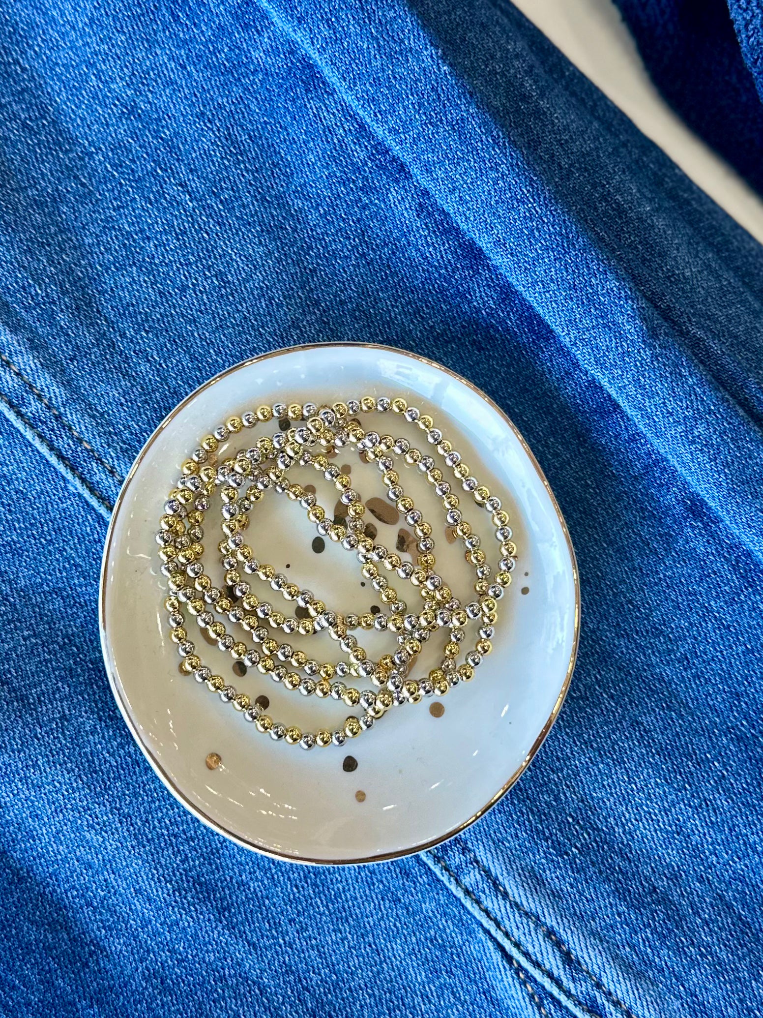 A timeless two-tone stretch bracelet featuring alternating gold and silver beads for effortless, everyday style. Designed with a comfortable stretch fit, this bracelet slips on easily and layers beautifully with your favorite jewelry.