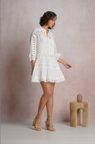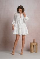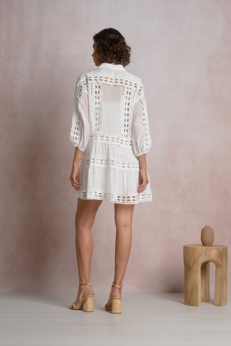 Romantic, refined, and effortlessly wearable. This white lace trim mini dress features delicate openwork lace detailing throughout, creating a beautiful balance of structure and softness.
