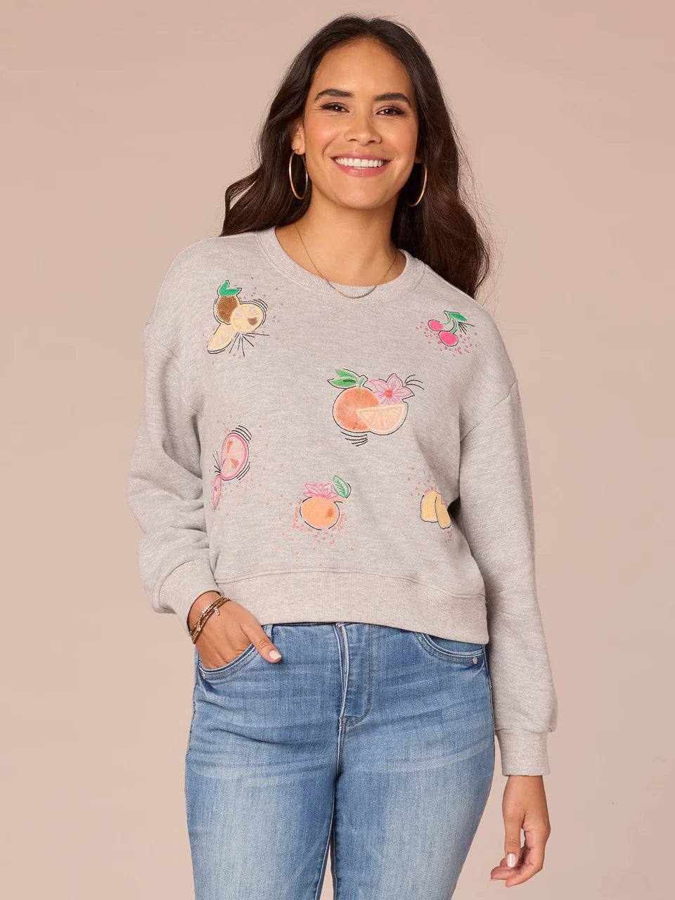 Heather gray pullover with colorful embroidered fruit graphics