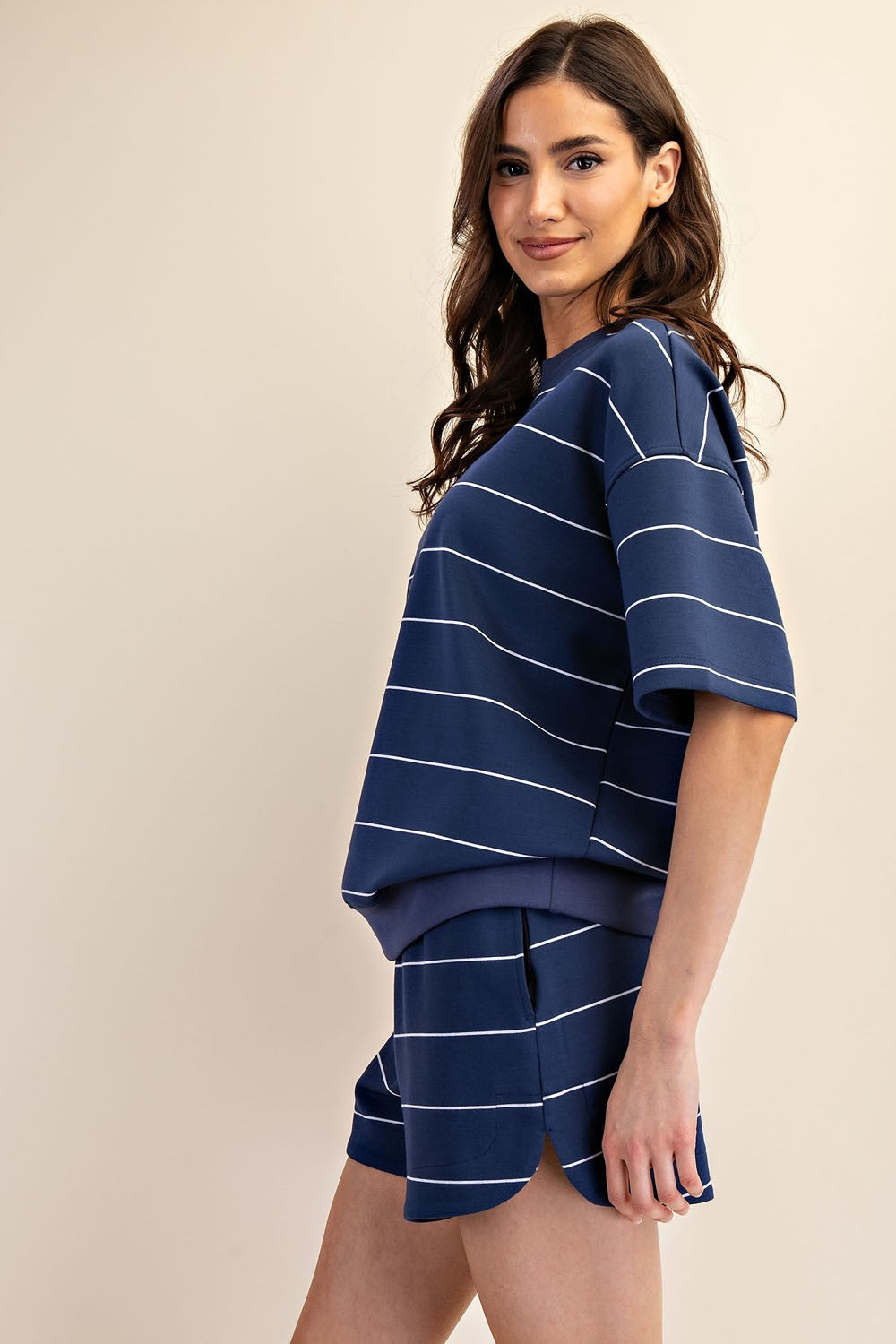 The matching partner to the striped shorts, this navy and white striped top combines comfort with a timeless nautical vibe. The boxy silhouette and dropped shoulders give it a laid-back, modern feel, while the midweight knit fabric offers structure. Side slits at the hem make it easy to front-tuck into shorts, jeans, or skirts.