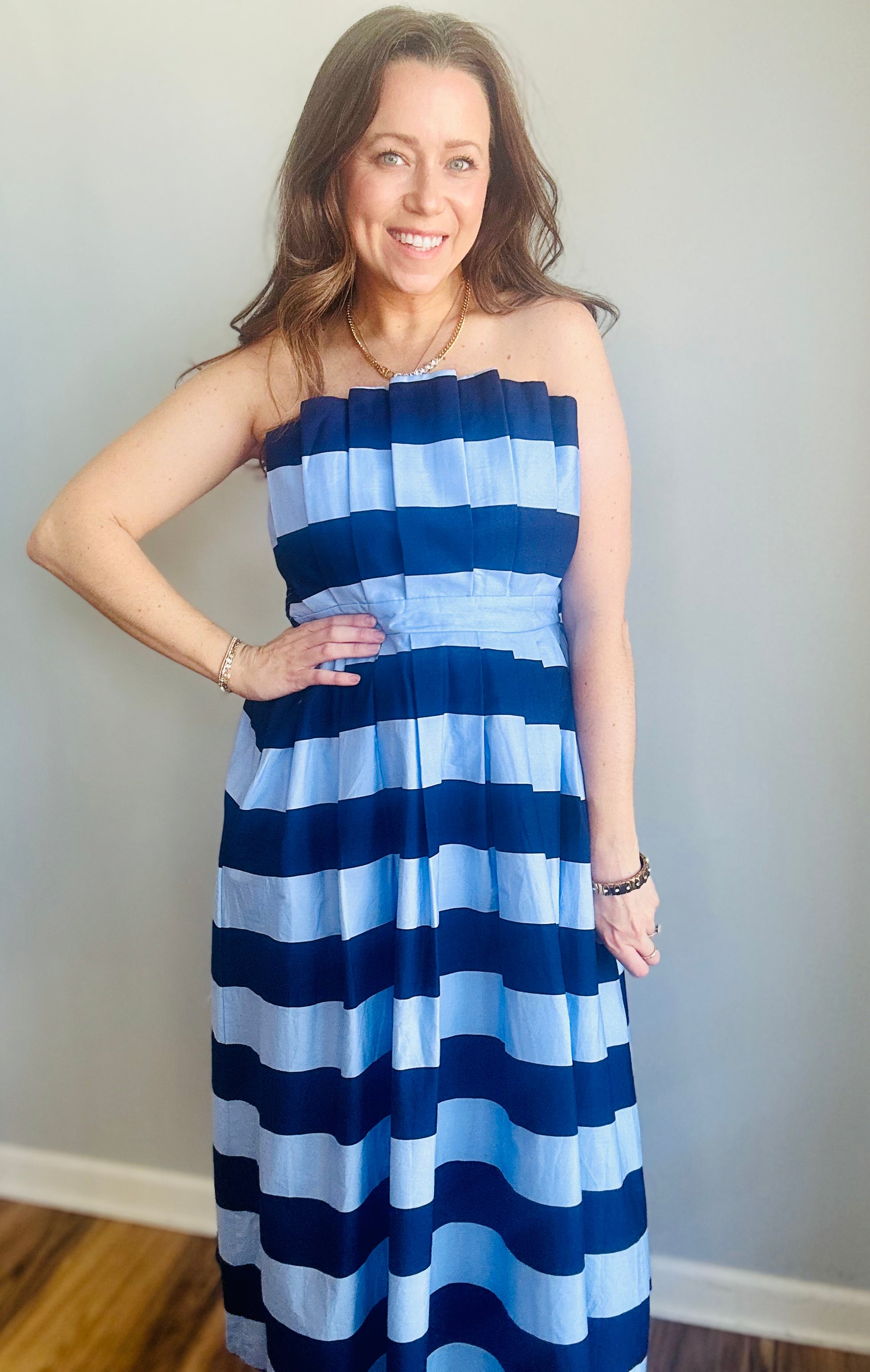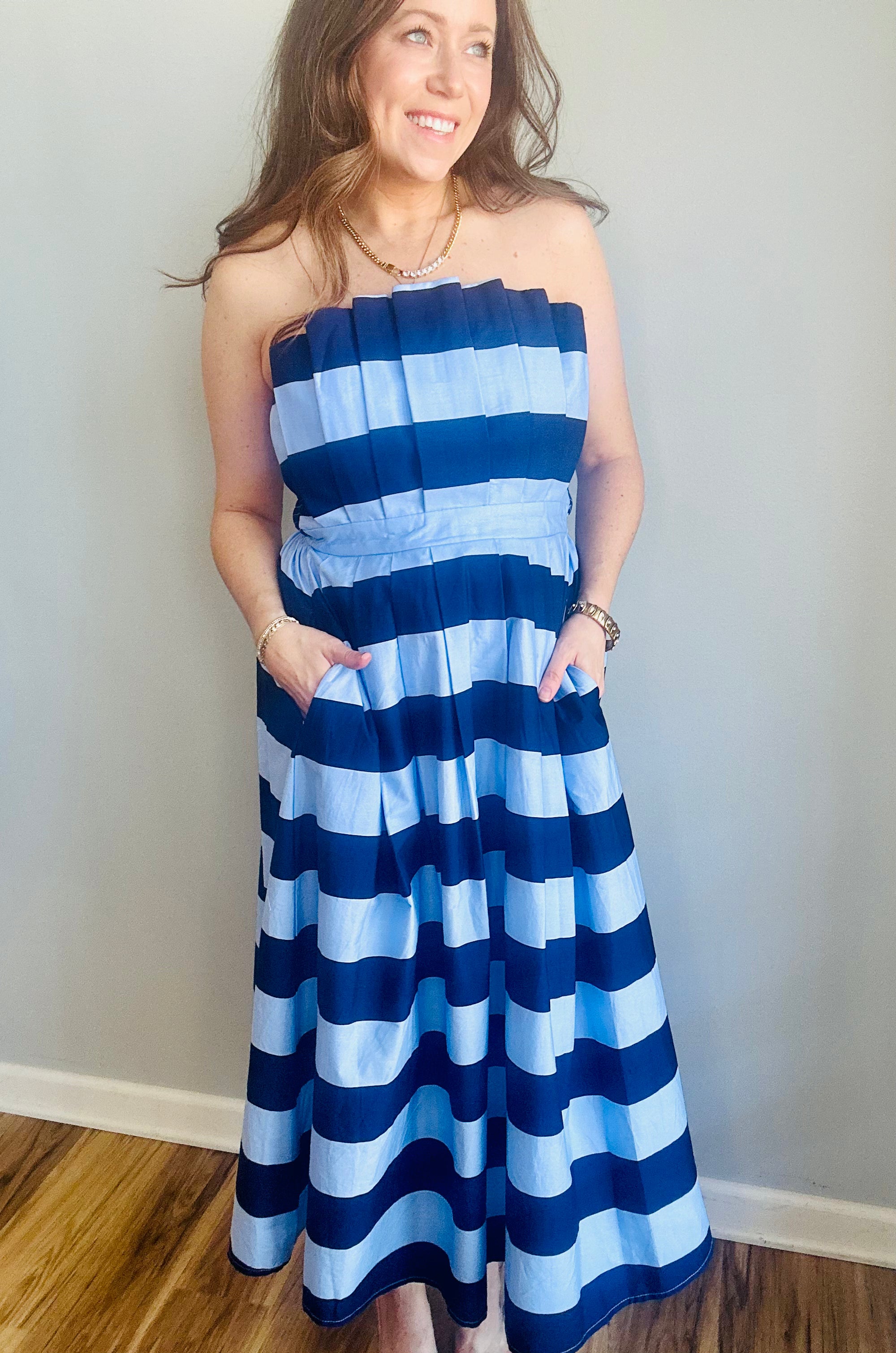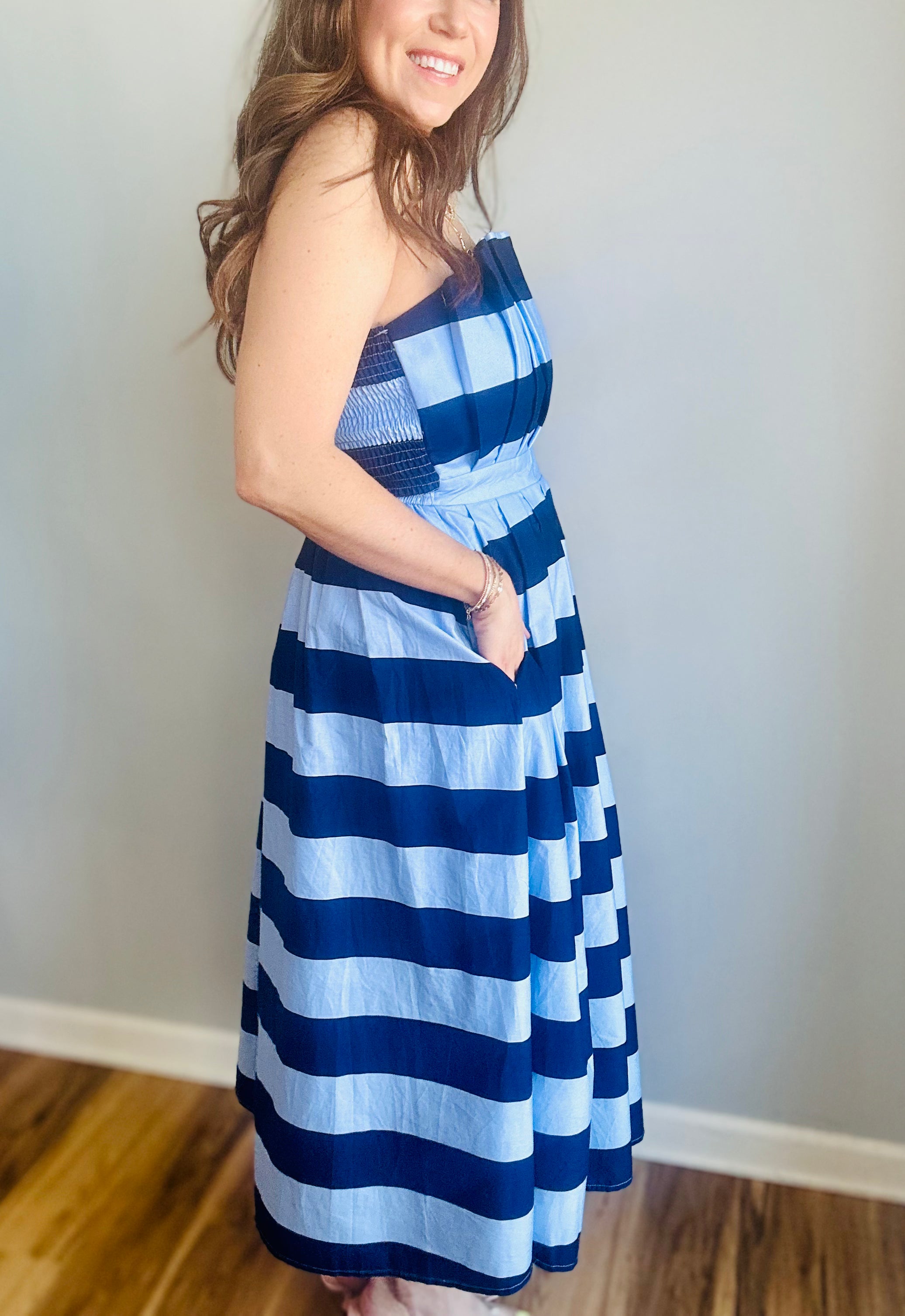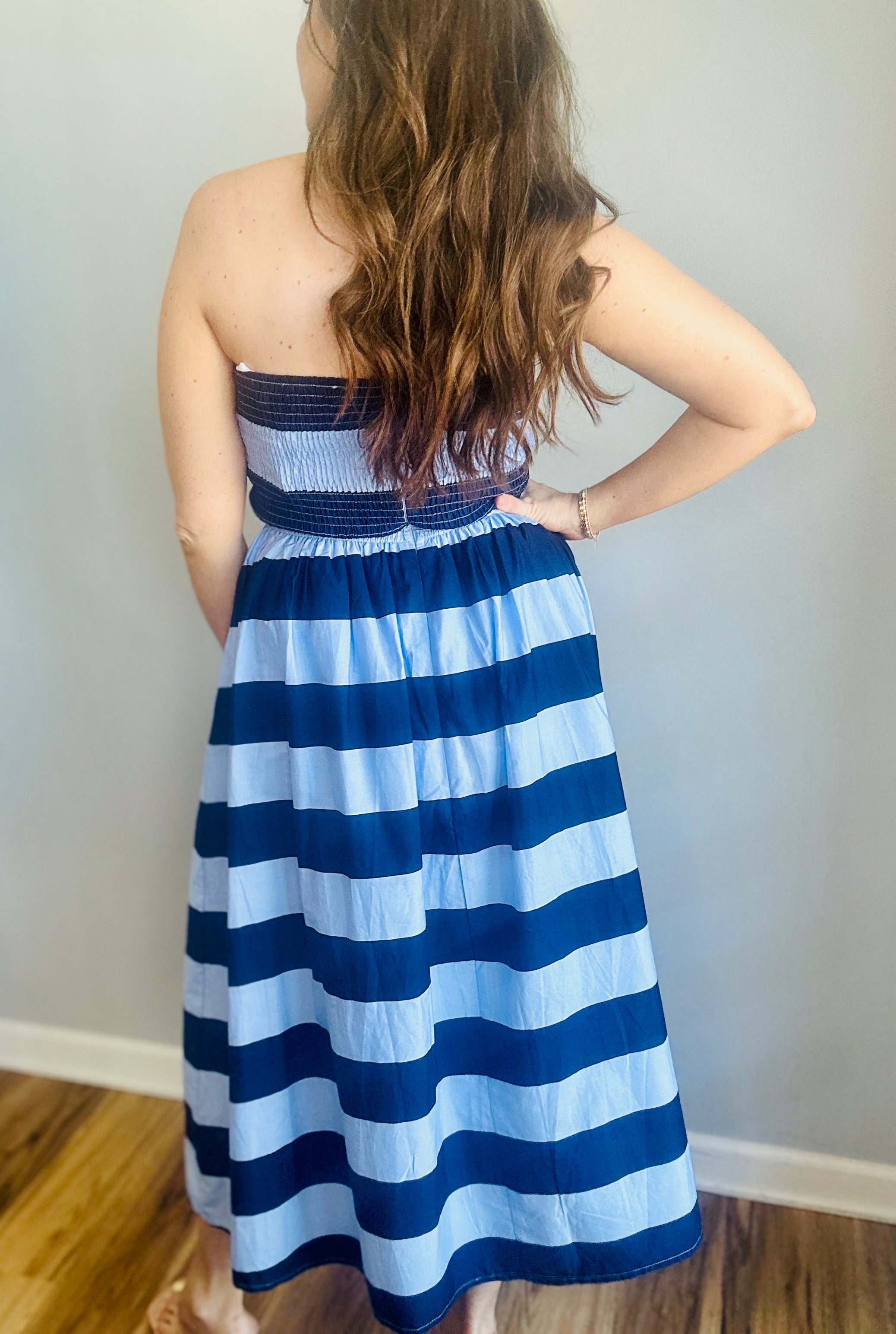 Striped Strapless Midi Dress | Navy & Sky Blue
