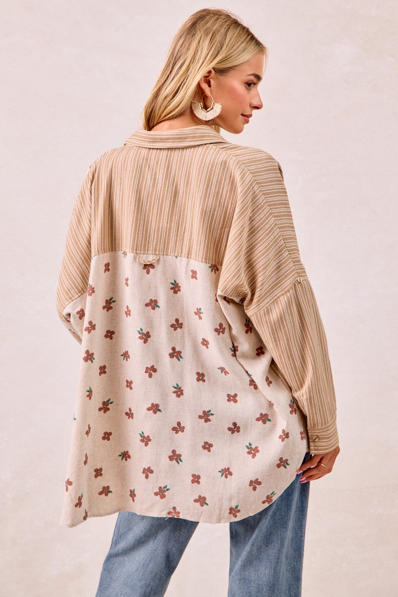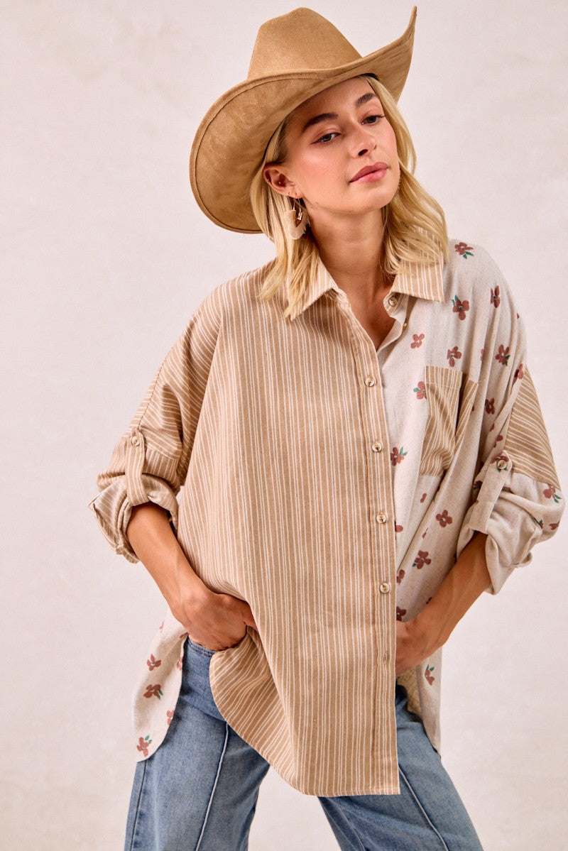 Two-Tone Mixed Print Oversized Button-Up