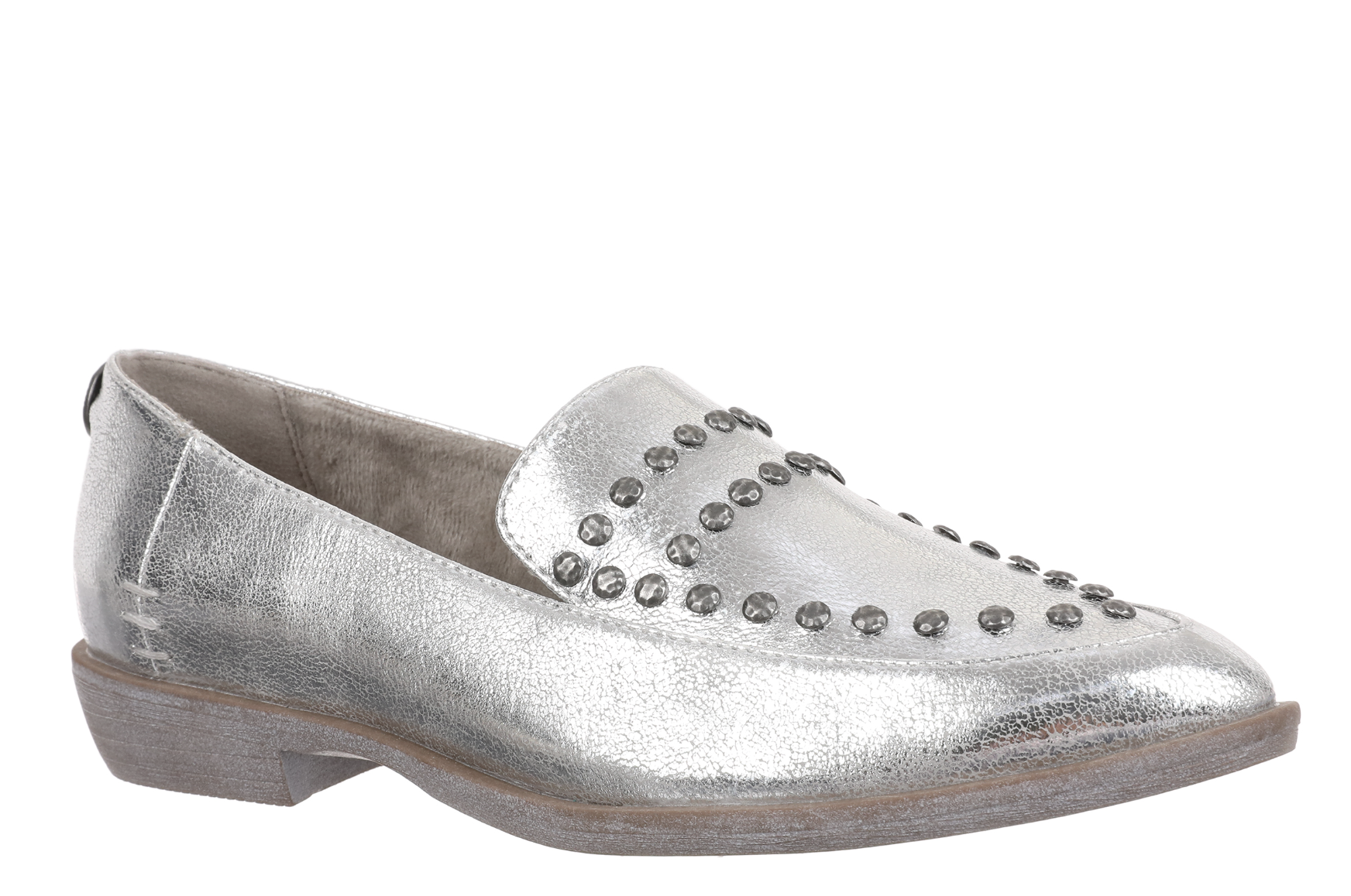 Step into style with these eye-catching metallic studded loafers, designed to add a bold, contemporary flair to any outfit. Featuring a sleek silver finish with a unique crackled texture, these loafers are adorned with stud detailing along the upper for a modern edge. The low stacked heel and slip-on design ensure all-day comfort, making them perfect for both casual wear and dressing up your look.