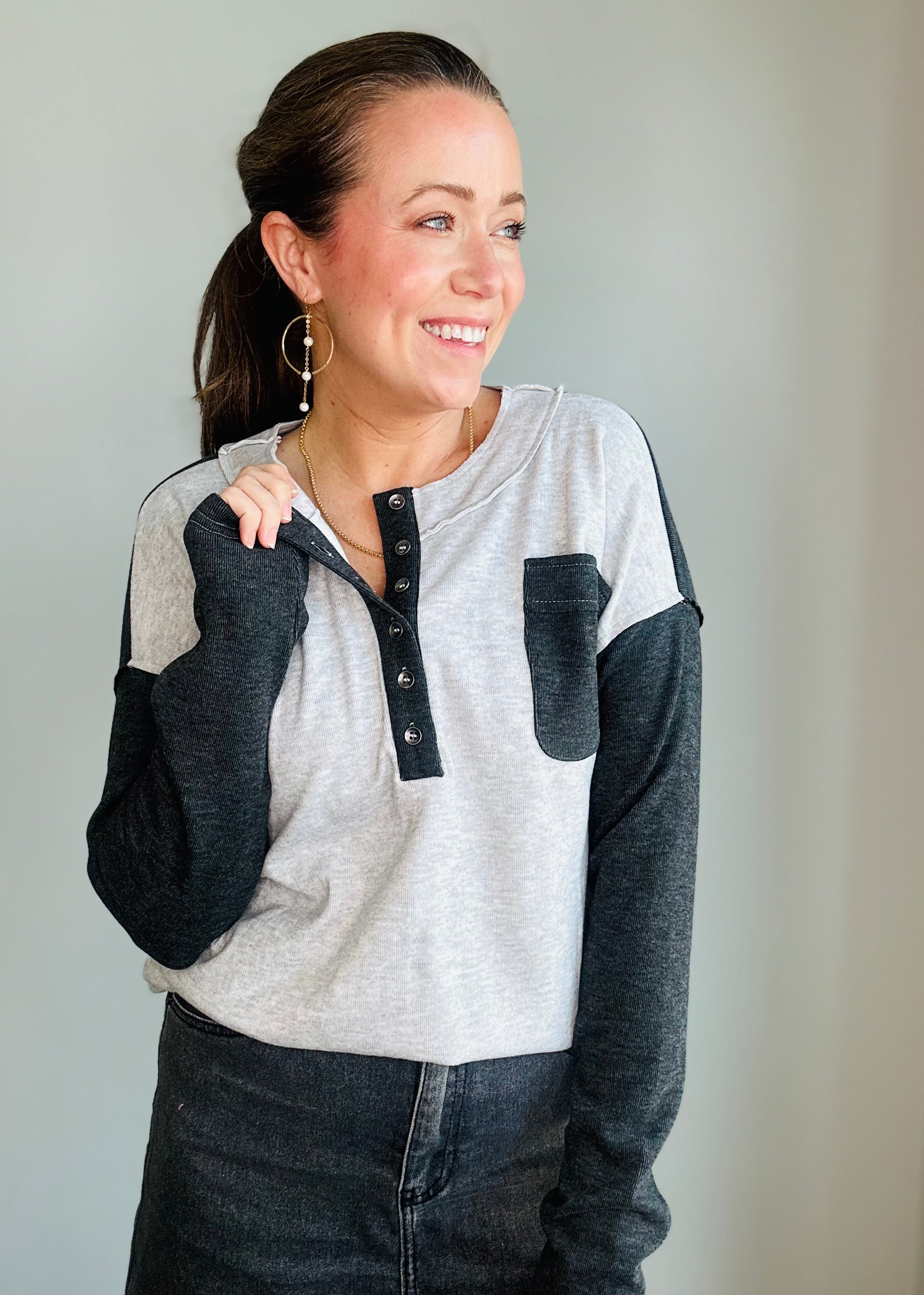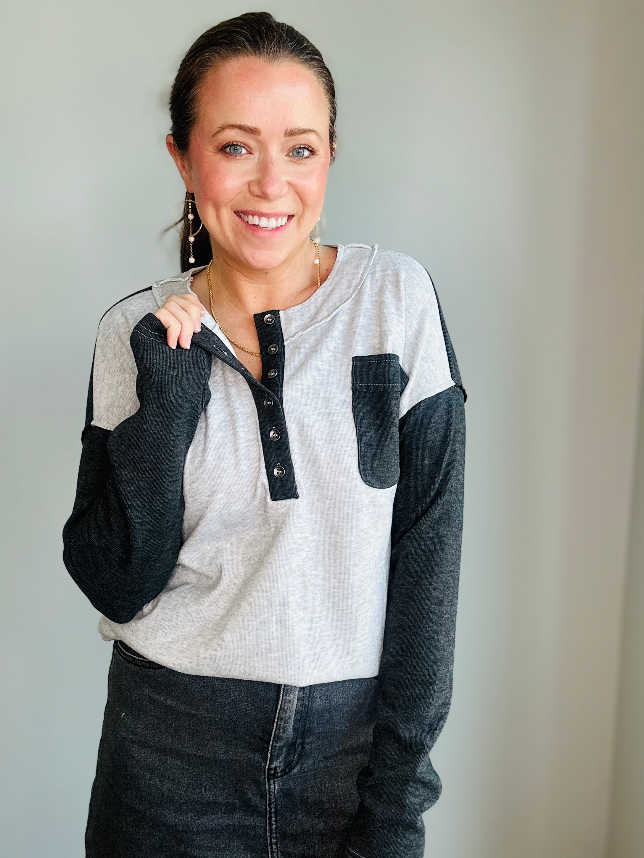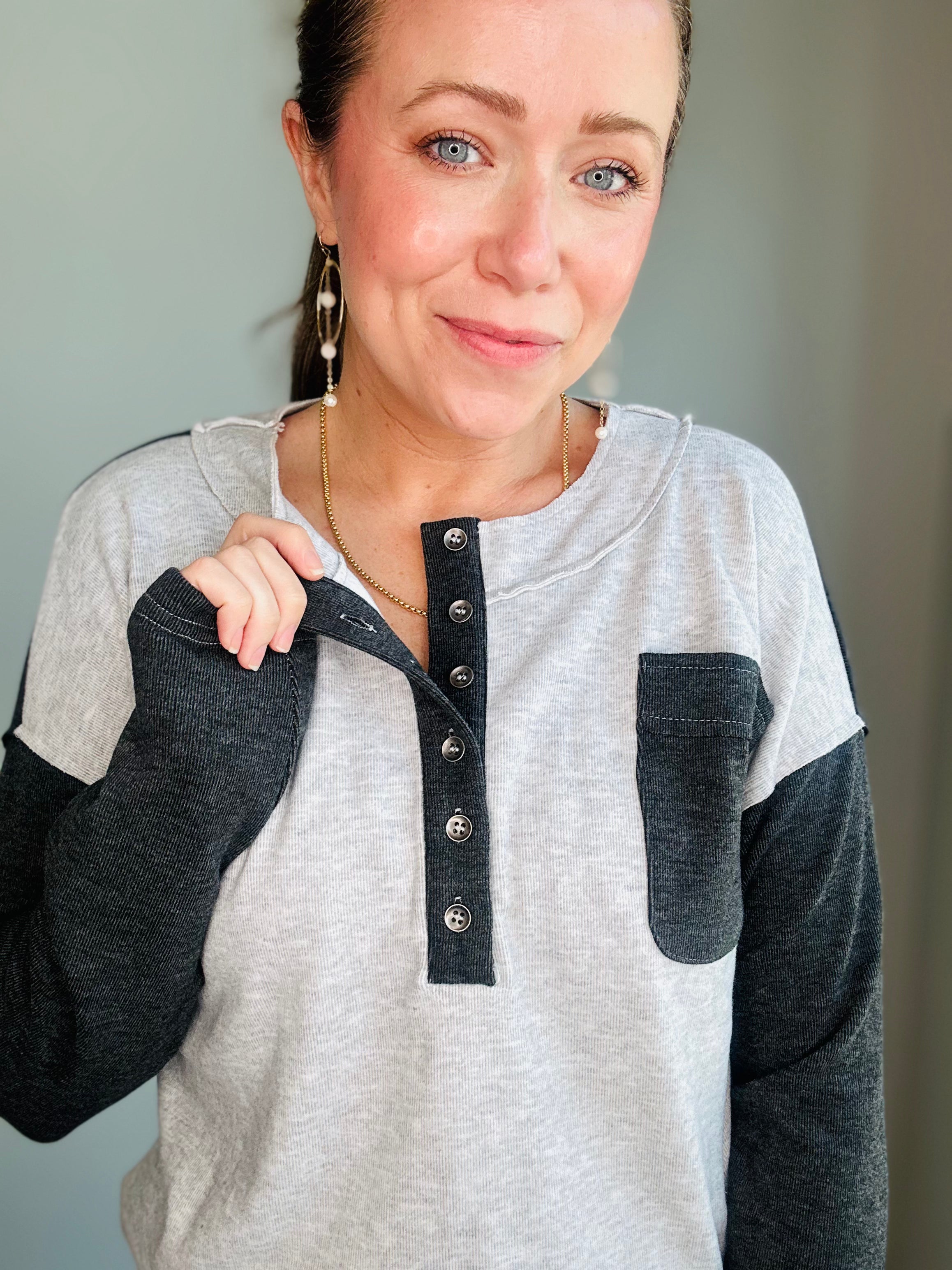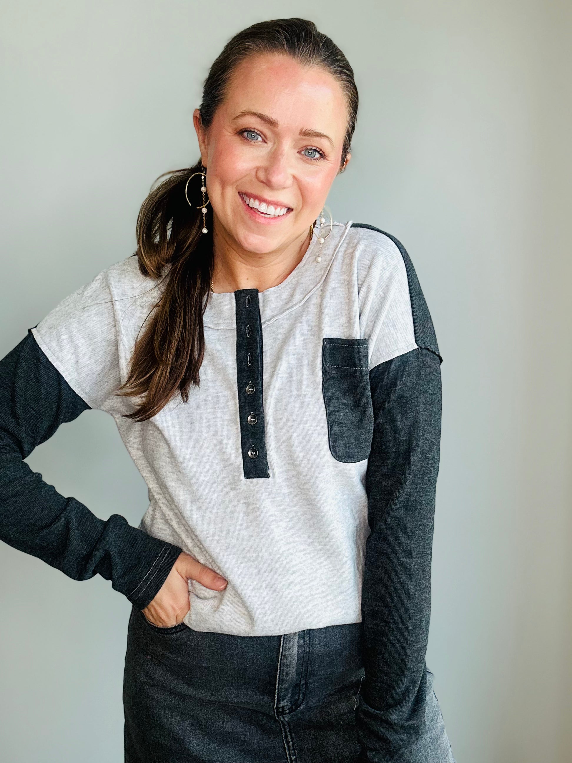 Upgrade your casual style with this colorblock Henley long sleeve top, designed for effortless everyday wear. Featuring a soft heather grey body with contrasting charcoal sleeves and pocket, this top brings a sporty yet chic vibe. The button-down Henley neckline adds a touch of versatility—wear it fully buttoned for a polished look or slightly open for a relaxed feel.