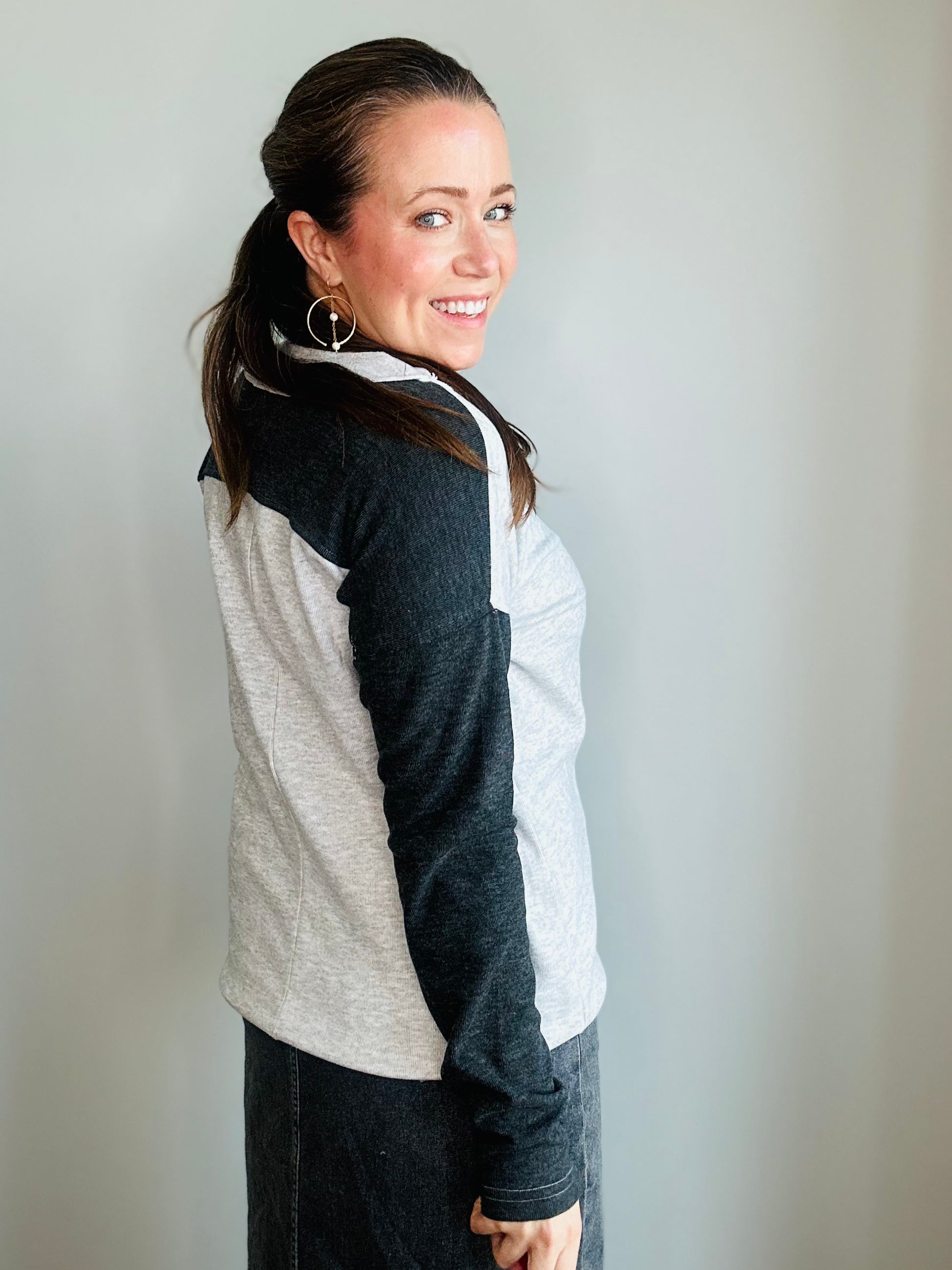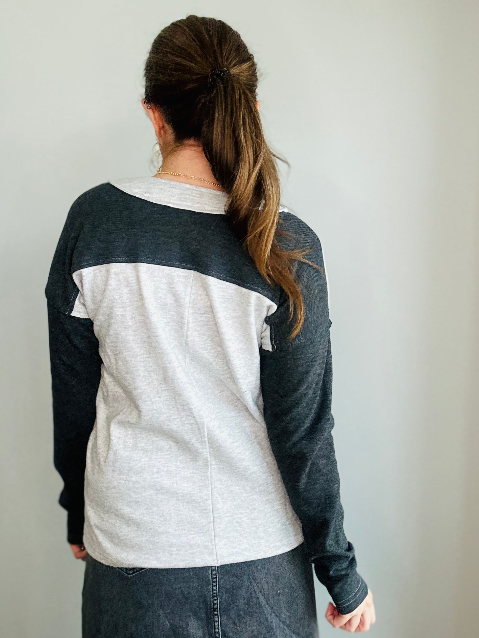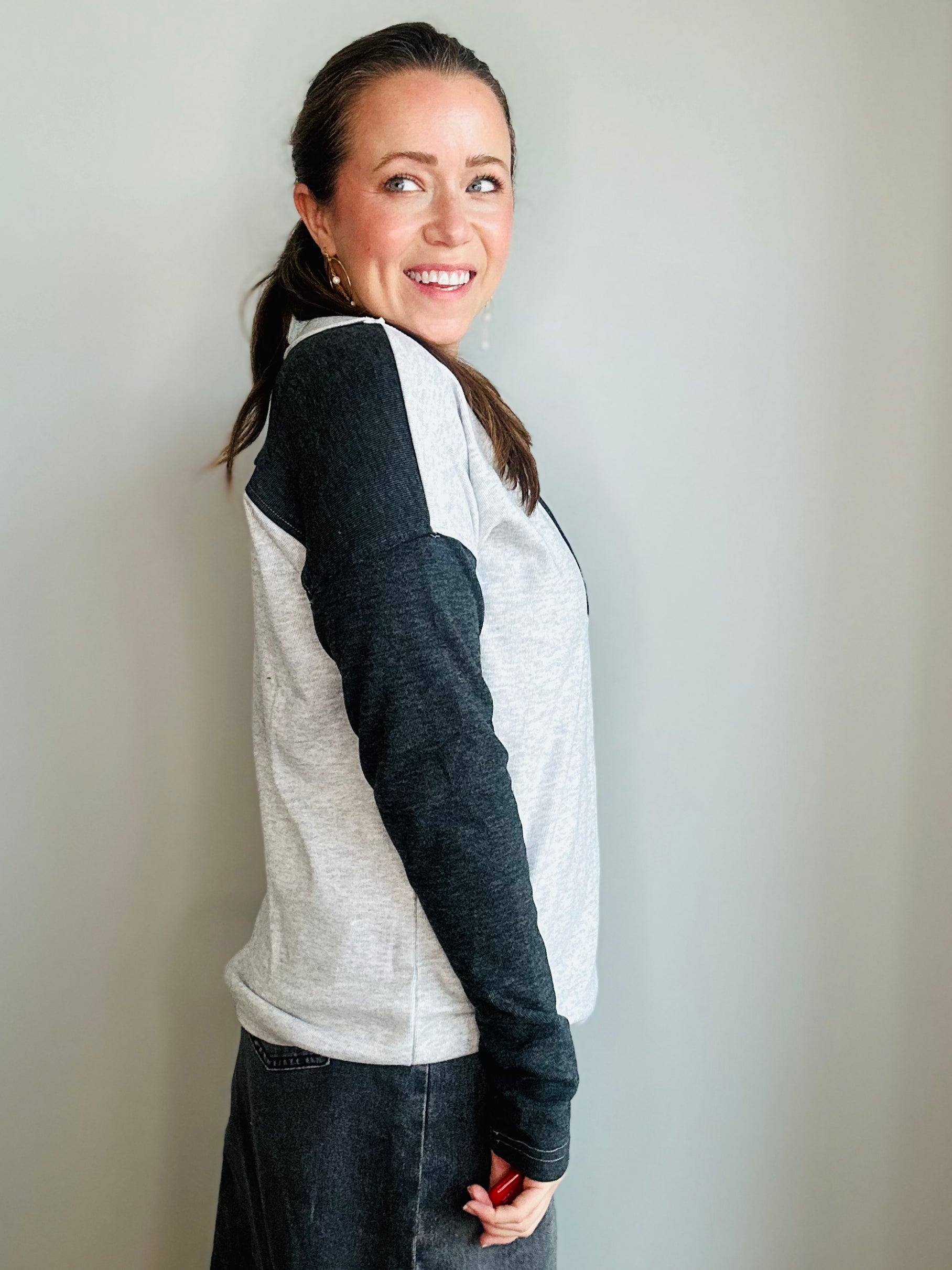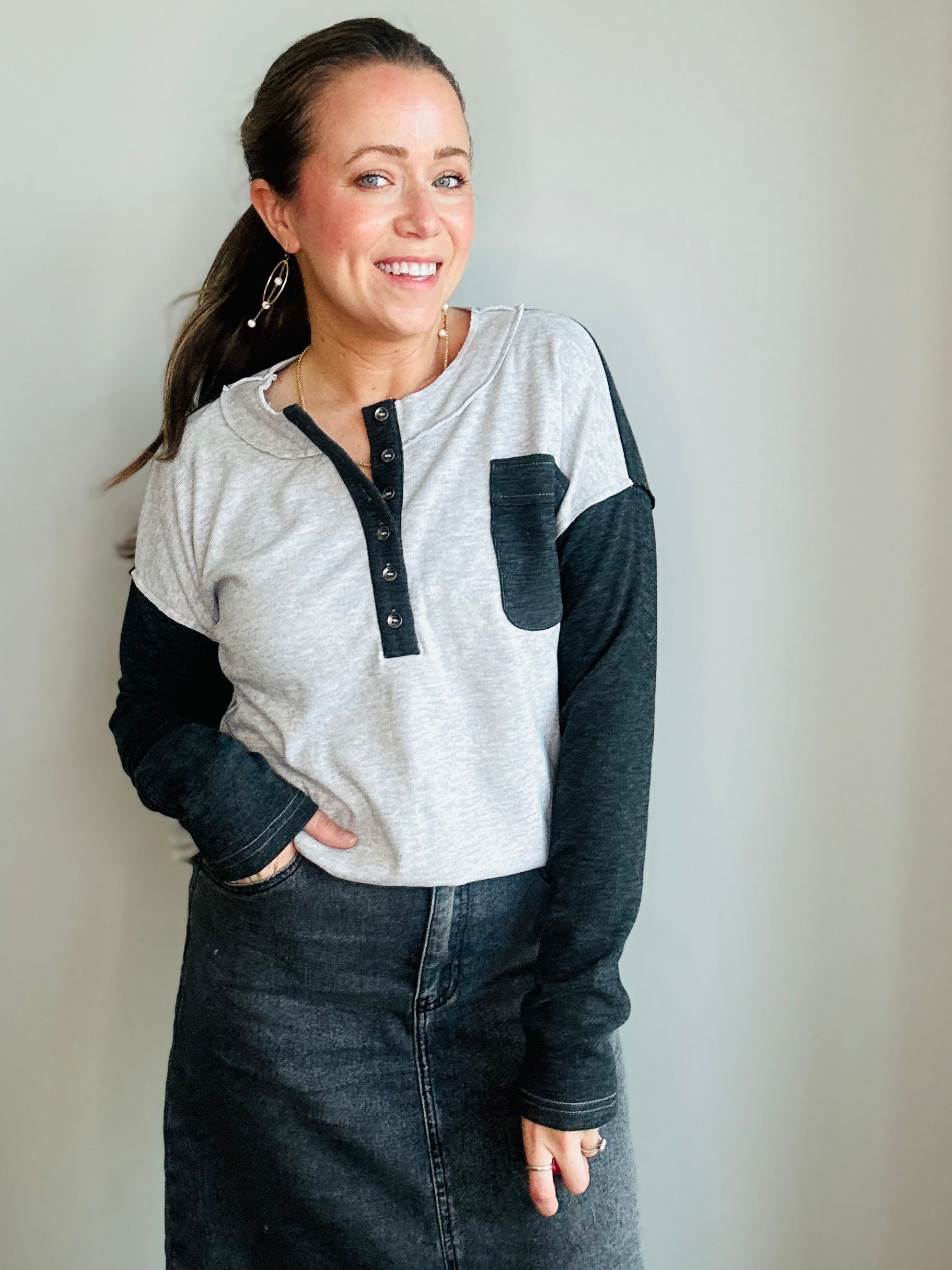 Upgrade your casual style with this colorblock Henley long sleeve top, designed for effortless everyday wear. Featuring a soft heather grey body with contrasting charcoal sleeves and pocket, this top brings a sporty yet chic vibe. The button-down Henley neckline adds a touch of versatility—wear it fully buttoned for a polished look or slightly open for a relaxed feel.