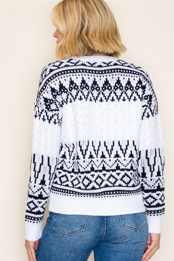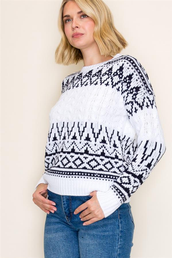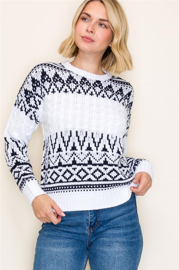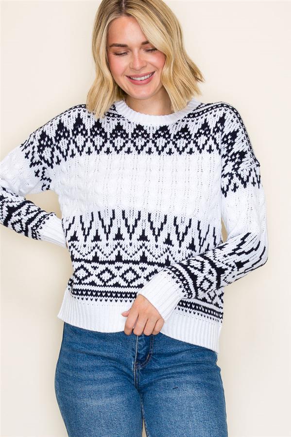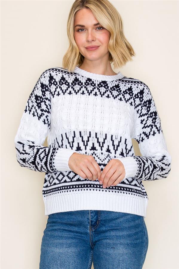 Classic meets cozy in the Fair Isle Cable Knit Sweater, designed with timeless winter charm. This midweight pullover features a traditional navy and white Fair Isle pattern with subtle cable detailing for extra texture and warmth. The crew neckline and ribbed trim complete the look, offering a polished fit that’s easy to style with denim, skirts, or layered over a collared shirt.
