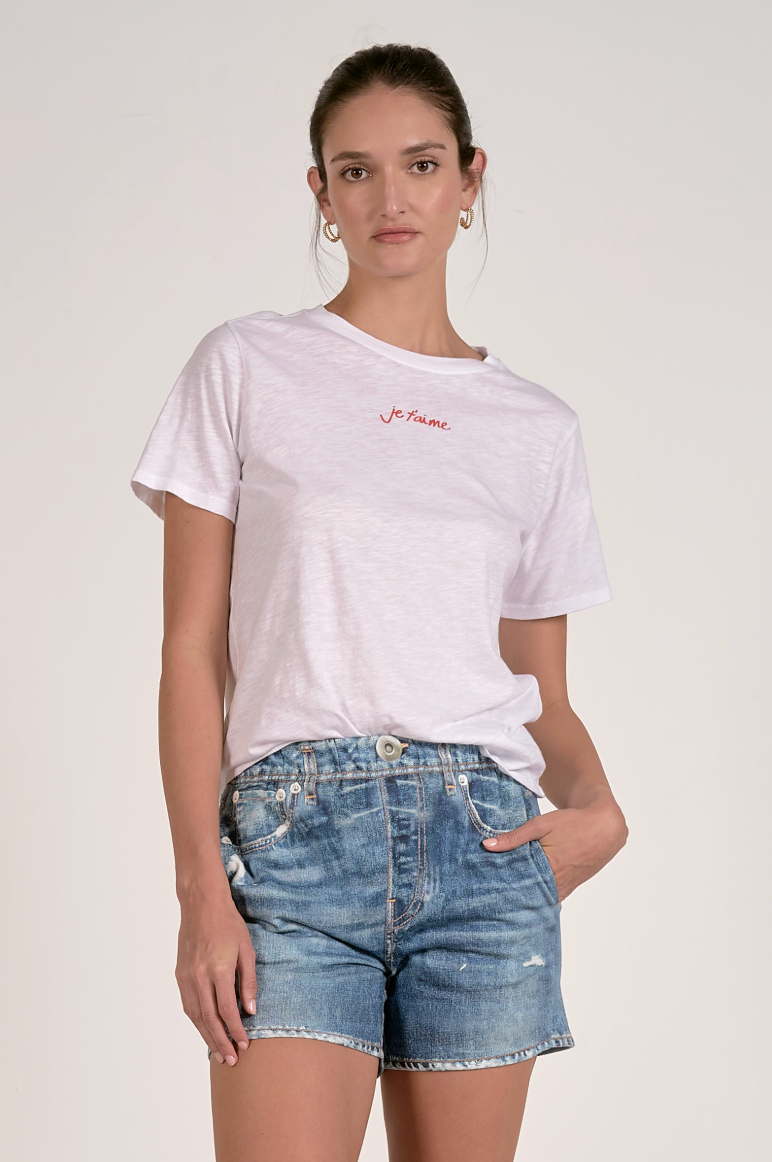 Red embroidered “Je T’aime” script at the front chest