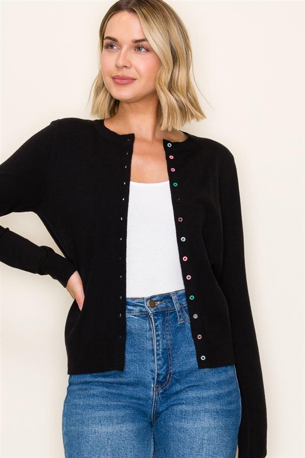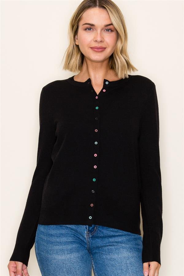 Add a playful twist to a timeless classic with this solid black cardigan. Featuring a sleek crew neckline and eye-catching multi-color buttons down the front, this piece brings both versatility and charm to your wardrobe. The long sleeves and lightweight knit make it perfect for layering over your favorite tops or dresses, while the fitted silhouette ensures a polished, put-together look.