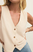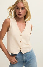 Soft, simple, and endlessly wearable—the Noelle Textured Vest is one of those pieces that quietly does it all. Designed in a lightweight textured knit with a flattering V-neckline and button-front detail, this sleeveless vest is perfect on its own or layered through the seasons. The heavy soft wash gives it that lived-in, comfortable feel while still looking polished and intentional.