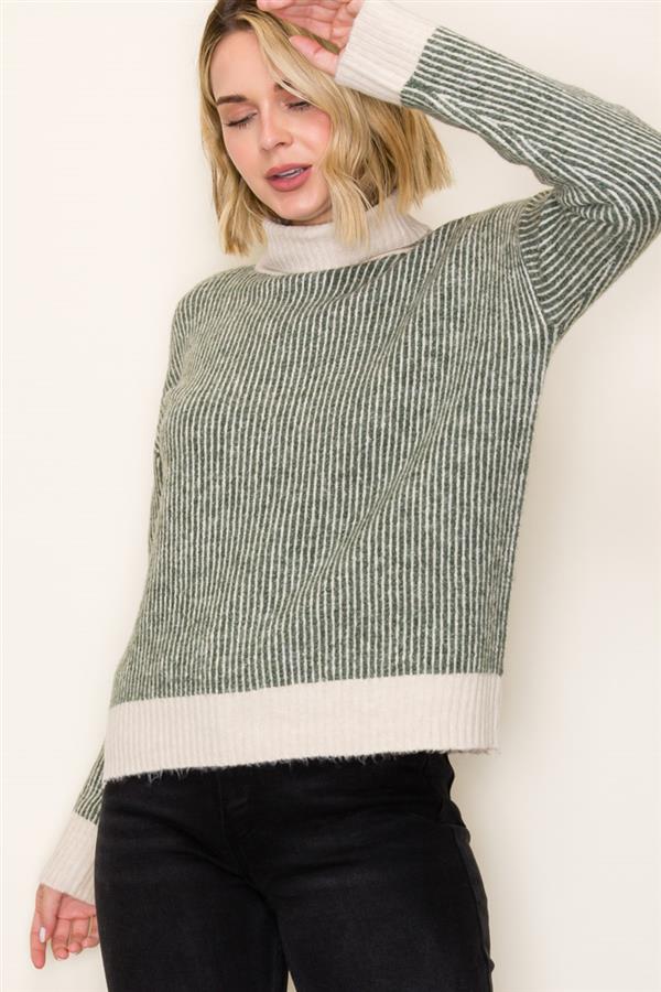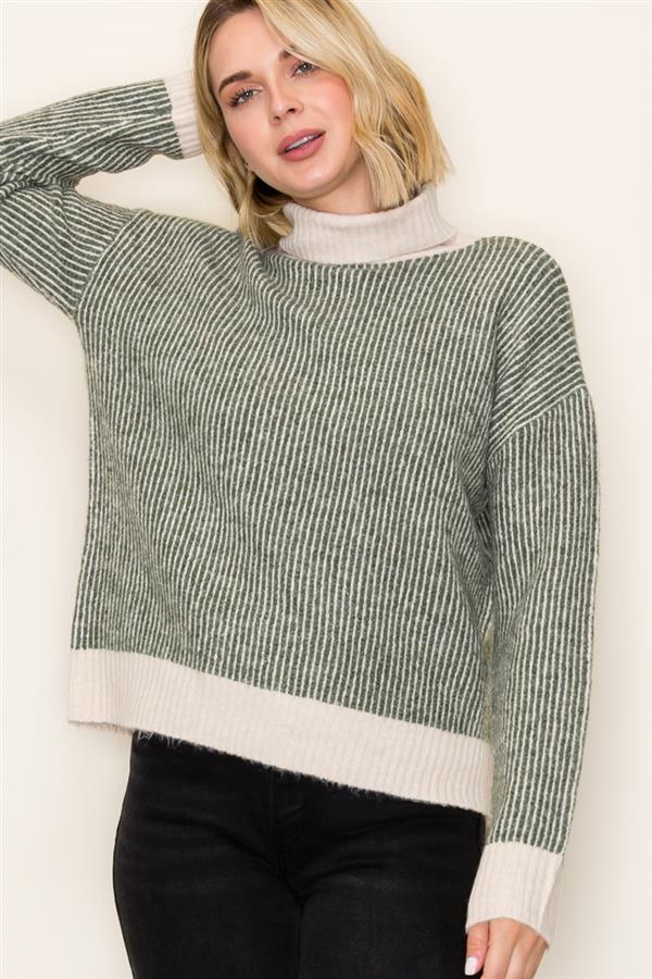 Striped Contrast Turtleneck Sweater in Dark Sage