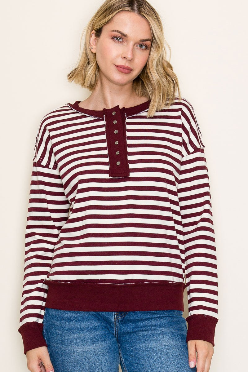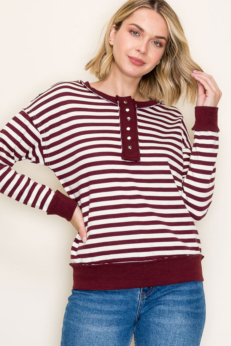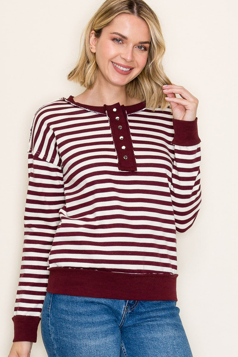 Effortless comfort meets casual chic in this striped pullover sweatshirt. Featuring classic henley snap buttons, ribbed cuffs, and a banded hem, this piece brings a sporty yet feminine vibe to your everyday style. The bold stripes and contrast detailing make it perfect for pairing with denim or joggers for a relaxed but put-together look.