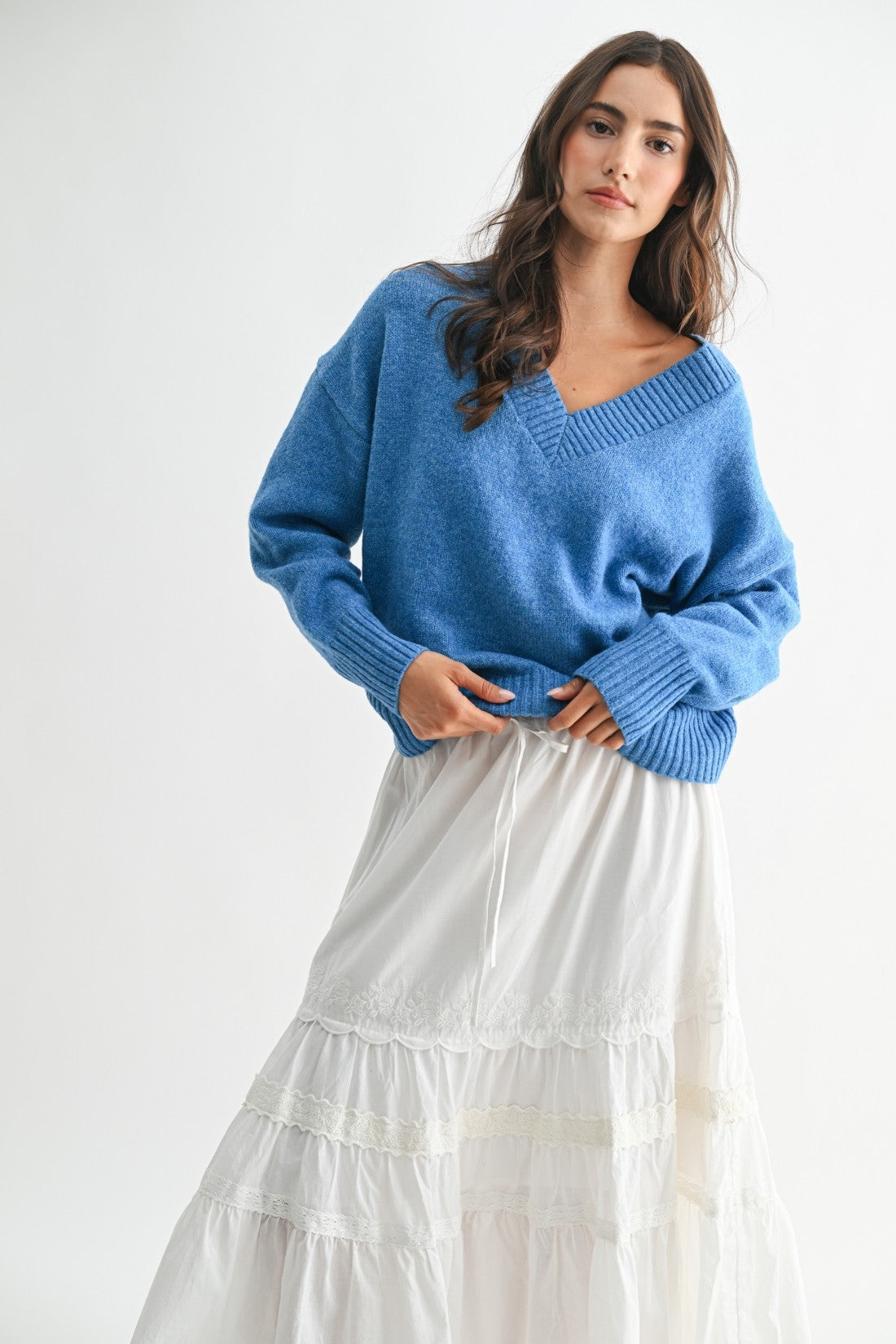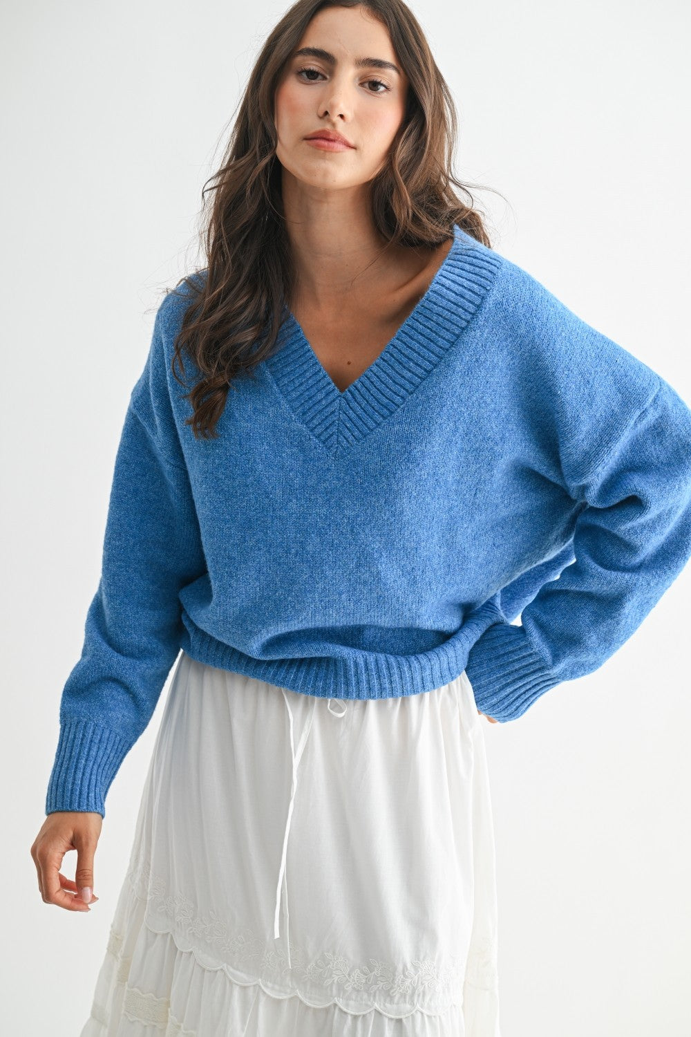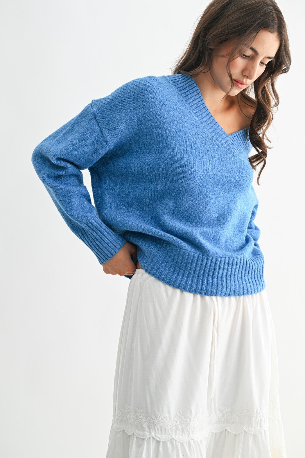 Looking for that go-to sweater you’ll reach for again and again? This soft, relaxed-fit knit in a bright sky blue delivers the perfect mix of comfort and style. Designed with a wide V-neckline, it flatters effortlessly and layers beautifully over camis, dresses, or collared shirts. The ribbed hem and cuffs add structure, while the cozy knit keeps it chic yet easygoing for any occasion.