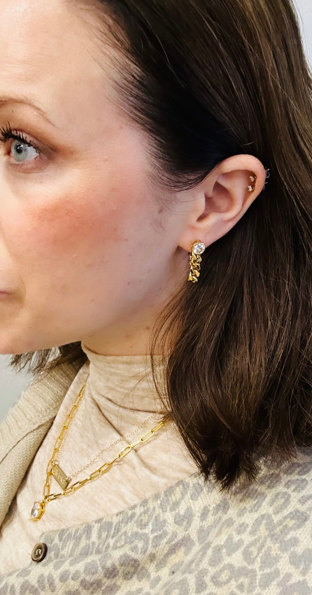 • Bezel-set crystal stud with chain loop detail