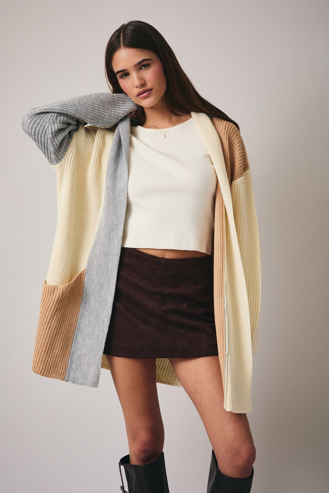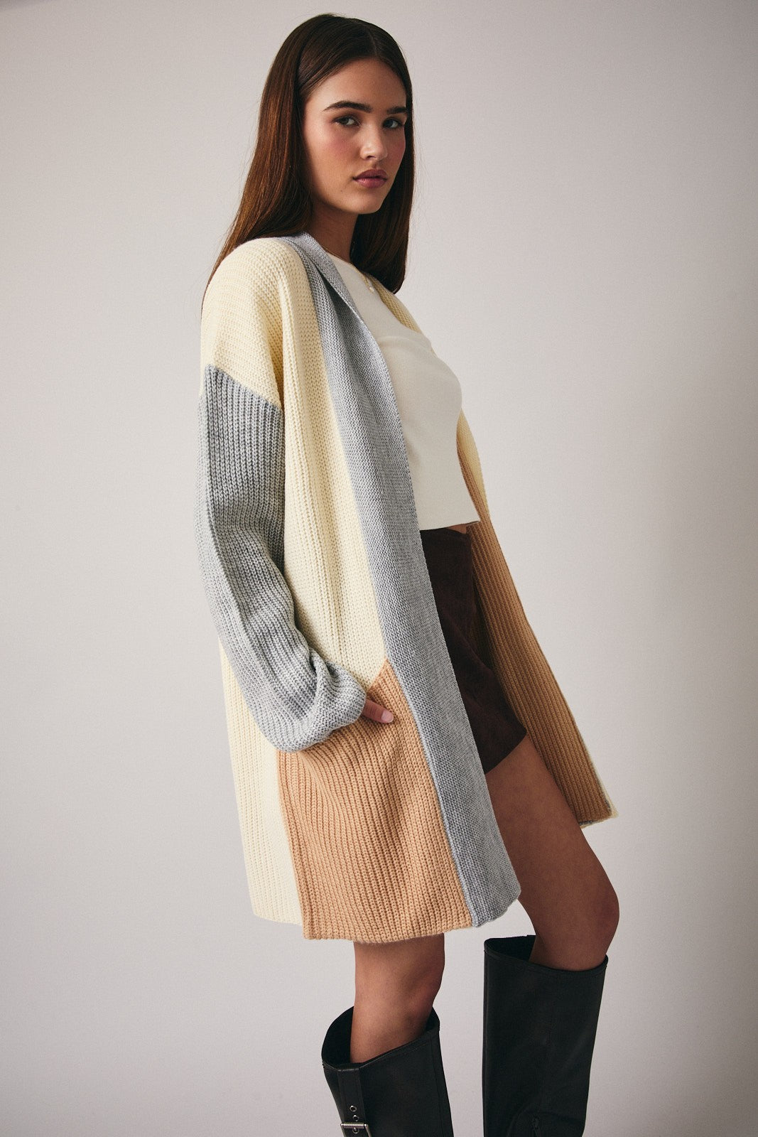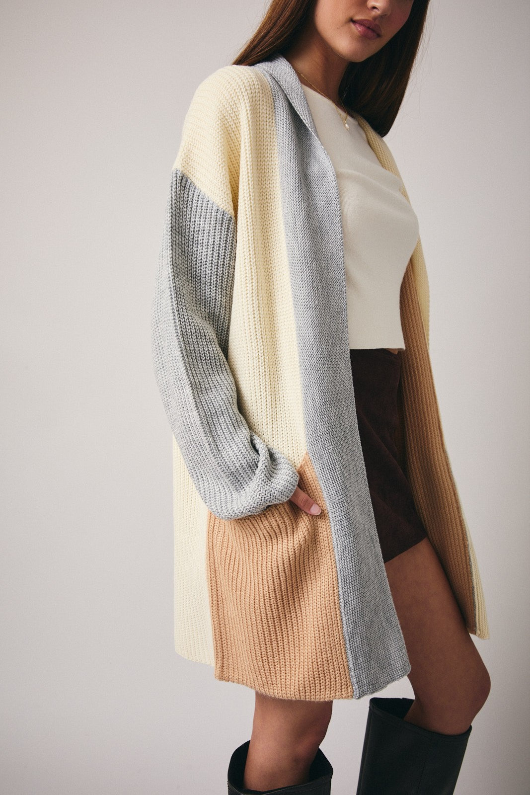 Wrap yourself in effortless style with this beautifully crafted colorblock cardigan, designed in a soft ribbed knit with a modern mix of neutral hues. Its relaxed, open-front silhouette makes it the perfect layering piece for every season—cozy enough for cool days yet lightweight enough for easy indoor wear. Dropped shoulders and roomy sleeves create a laid-back, elevated feel, while oversized patch pockets add both charm and practicality.