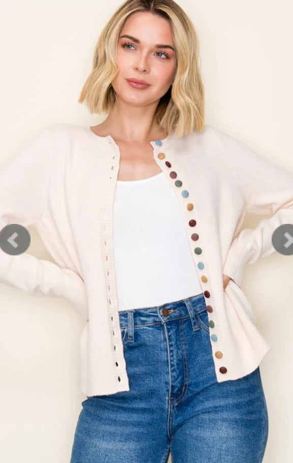 Multi-Color Button Trimmed Crew Neck Cardigan
