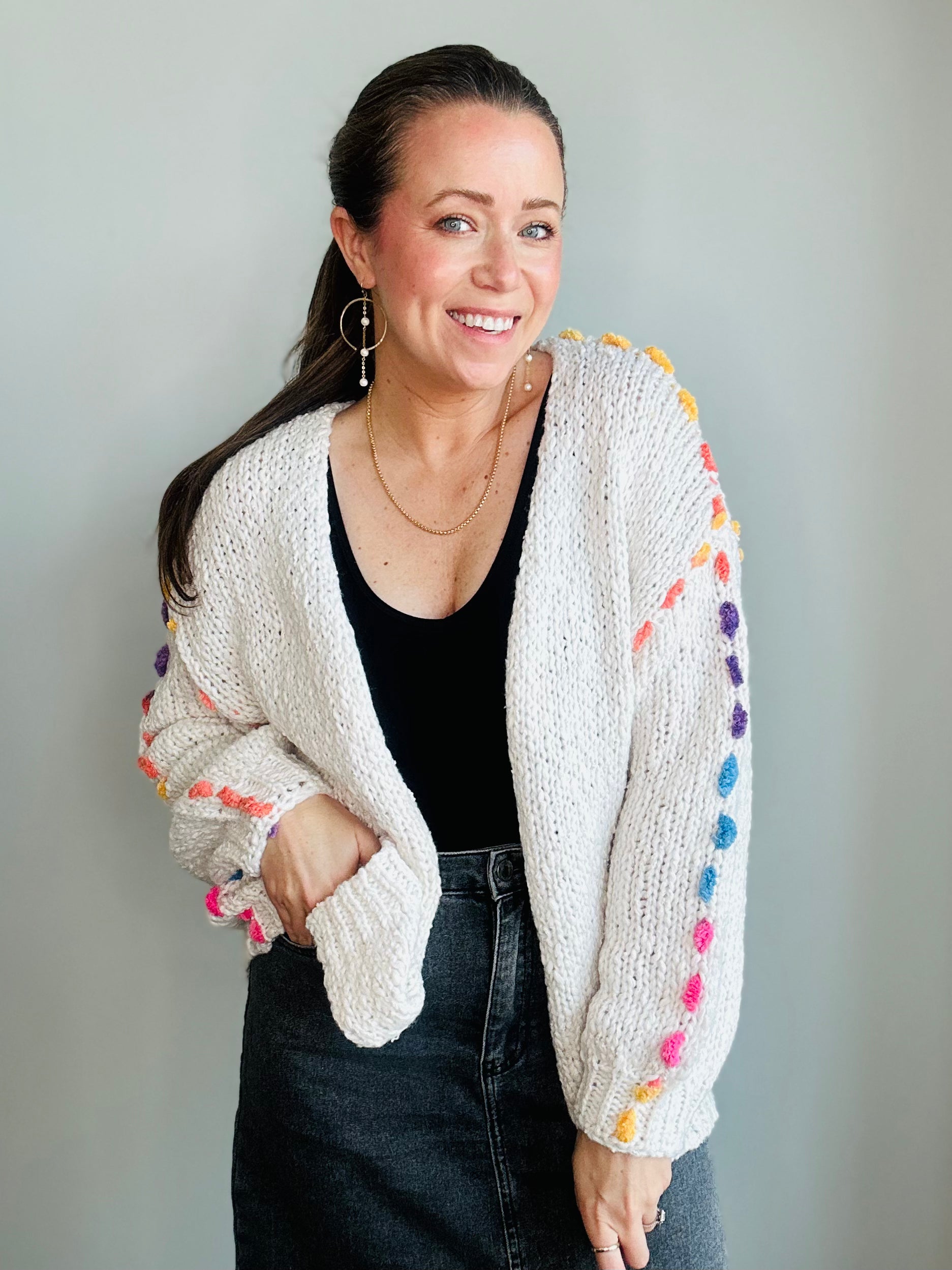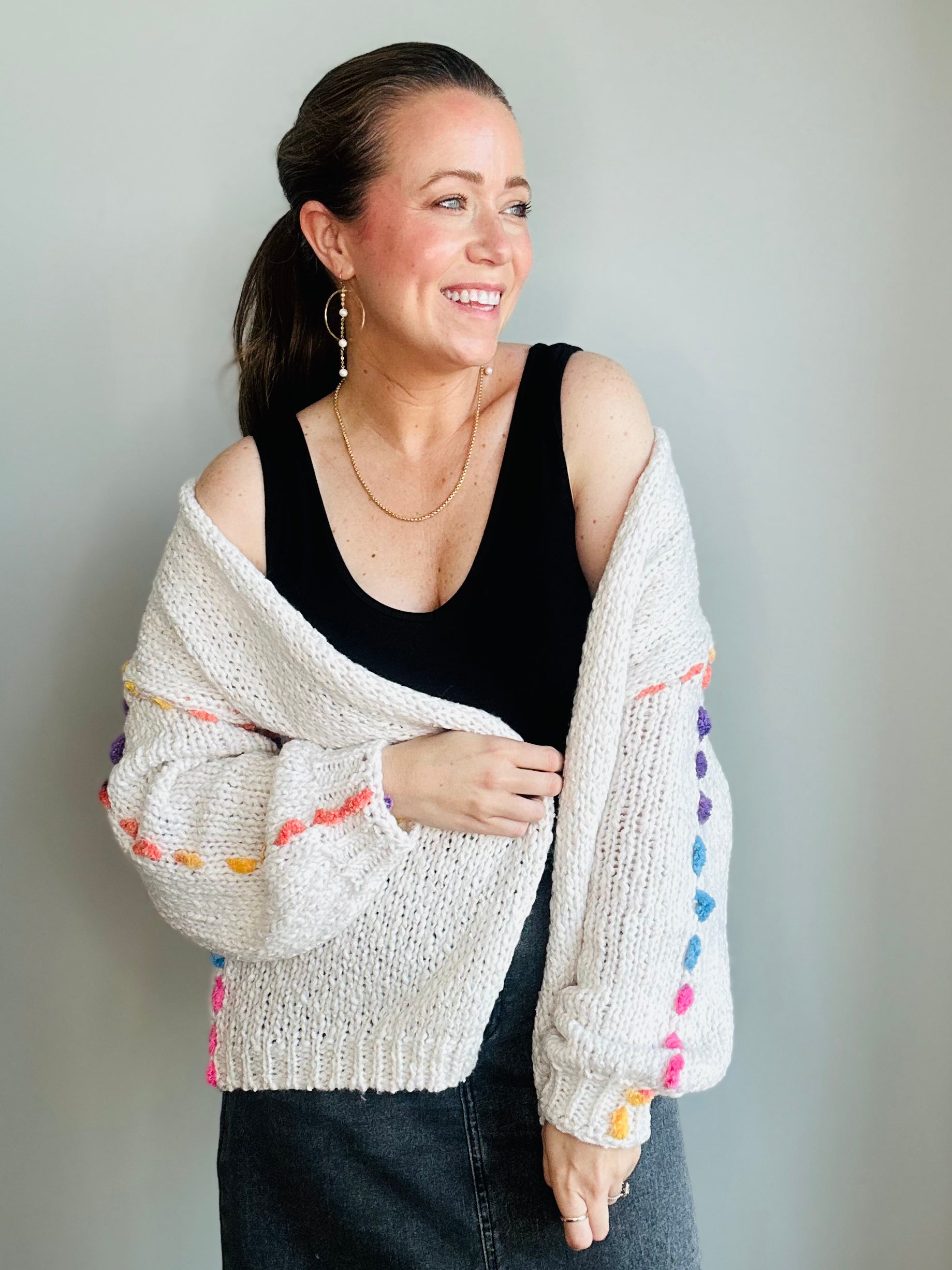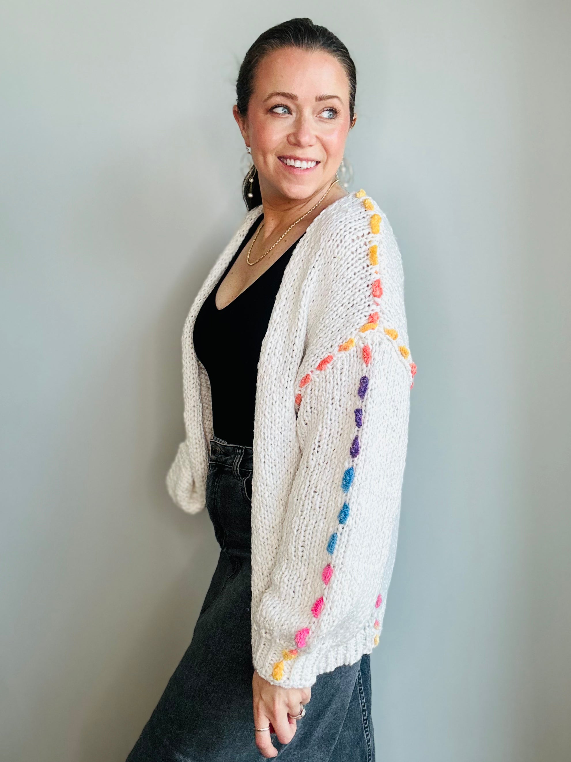 Bring playful charm to your layering collection with this chunky knit cardigan featuring a soft cream base and rainbow-colored yarn running through the sleeves. Designed with an oversized, relaxed fit, this cozy sweater adds both warmth and personality to any outfit.